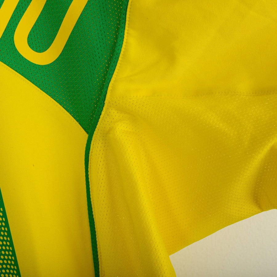 Maglia ufficiale home della nazionale brasiliana prodotta da Nike per la stagione 2004/2005, con personalizzazione Ronaldinho numero 10. Classico design giallo con inserti verdi sul colletto e sulle maniche. Stemma CBF ricamato al centro del petto, con 5 stelle sopra a celebrare i successi mondiali. Logo Nike ricamato in verde sul lato destro. Numero 10 stilizzato stampato sul fronte e sul retro. Tecnologia Nike Sphere Dry per garantire comfort e traspirabilità. Maglia simbolo del Brasile degli anni 2000 e della magia di Ronaldinho.