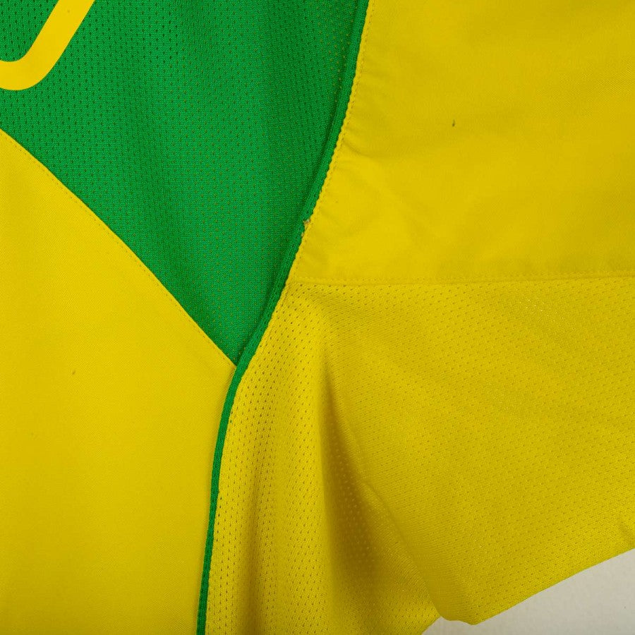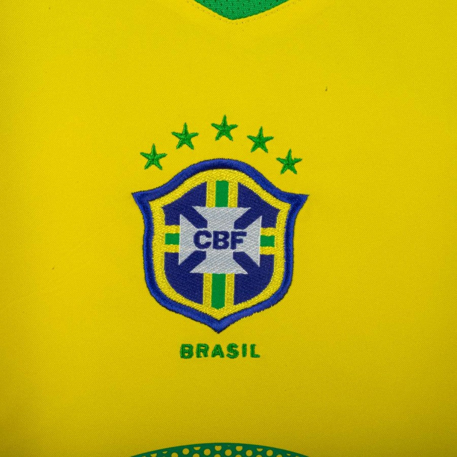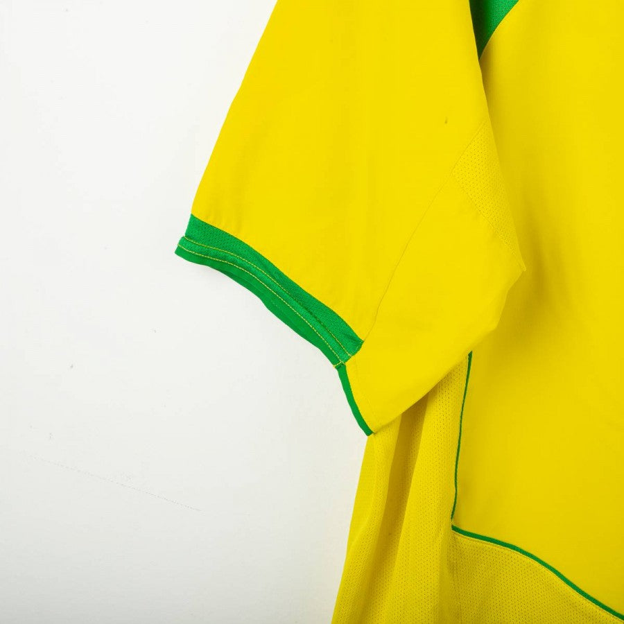 Maglia home del Brasile utilizzata nella stagione 2004/2005, prodotta da Nike. Classica colorazione gialla con dettagli verdi su spalle, colletto e maniche. Logo Nike ricamato sul petto destro, stemma della CBF cucito lato cuore con cinque stelle superiori per celebrare i titoli mondiali. Numero 9 stampato al centro e sul retro, con nome Ronaldo in alto. Tecnologia Nike “Total 90” con inserti in mesh per una maggiore traspirabilità. Vestibilità regolare. Taglia XL.
