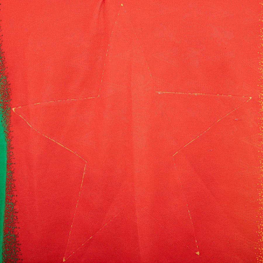 La maglia presenta un audace mix di colori verde, rosso e giallo con un elegante colletto rialzato che si allaccia tramite tre bottoni arancioni,