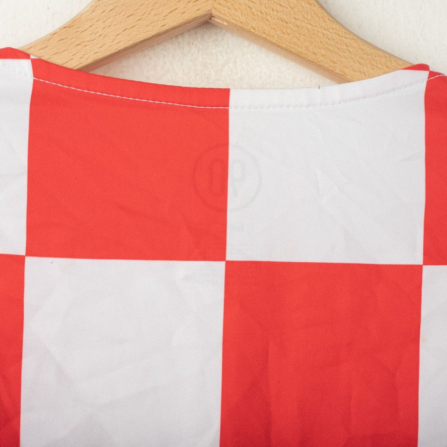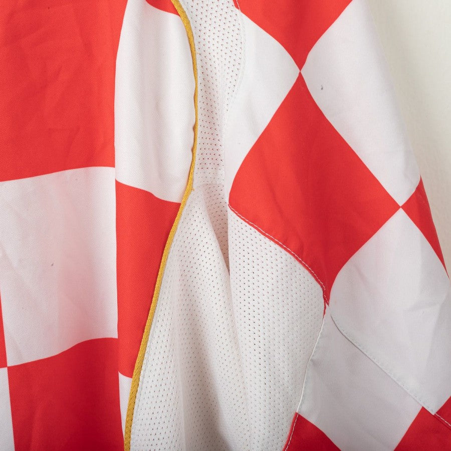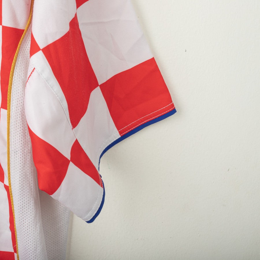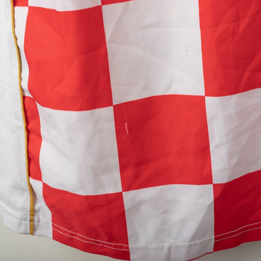 Maglia Home Croazia Nike 2004, taglia M. Questo iconico design a scacchi rossi e bianchi, simbolo indiscusso della nazionale croata, è realizzato da Nike e presenta il logo federale al centro del petto. Sul fronte è presente anche il caratteristico swoosh Nike blu. La maglia include inserti gialli lungo i lati e dettagli blu sui bordi delle maniche, con una costruzione leggera e traspirante pensata per il comfort in campo.
