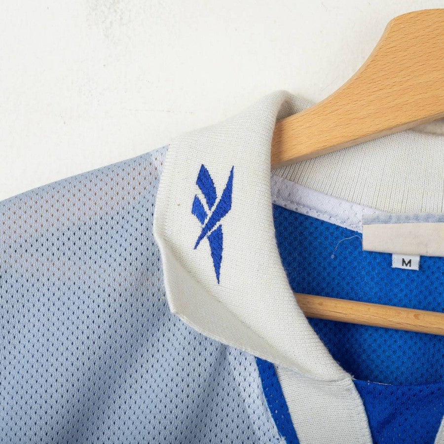 Maglia ufficiale casalinga del Club Sport Emelec per la stagione 2000, prodotta da Reebok. Il design iconico presenta una base blu elettrico con inserti bianchi e dettagli a contrasto in mesh traspirante, arricchita dallo sponsor principale "Cerveza Club" stampato sul fronte. Il colletto a polo con richiami Reebok ricamati e lo stemma del club cucito sul petto donano un tocco classico e distintivo. Sul retro, ampia presenza del logo Reebok e degli sponsor. Taglia M, condizioni molto buone.