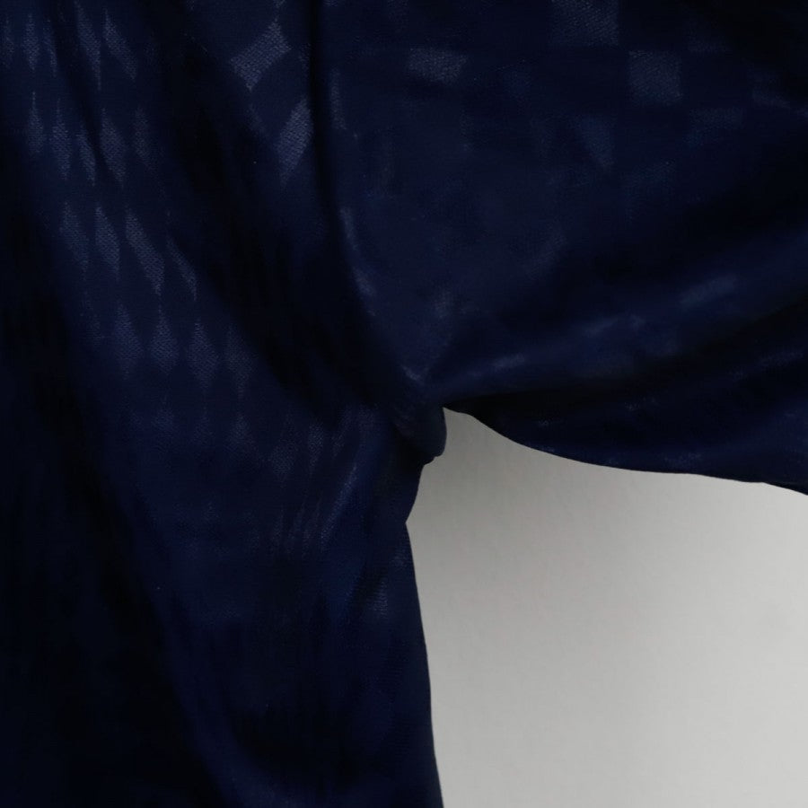 Maglia home ufficiale della Fidelis Andria per la stagione 1997/1998, prodotta da Biemme. La divisa si distingue per il suo colore blu scuro con dettagli bianchi e azzurri, caratterizzata da un motivo geometrico e dalla fascia verticale laterale con il simbolo del leone, iconico della squadra. Sul petto troviamo lo sponsor BPA, il logo Biemme e lo stemma della Fidelis Andria. Sul retro è presente il nome "Franchini" con il numero 2 in bianco.