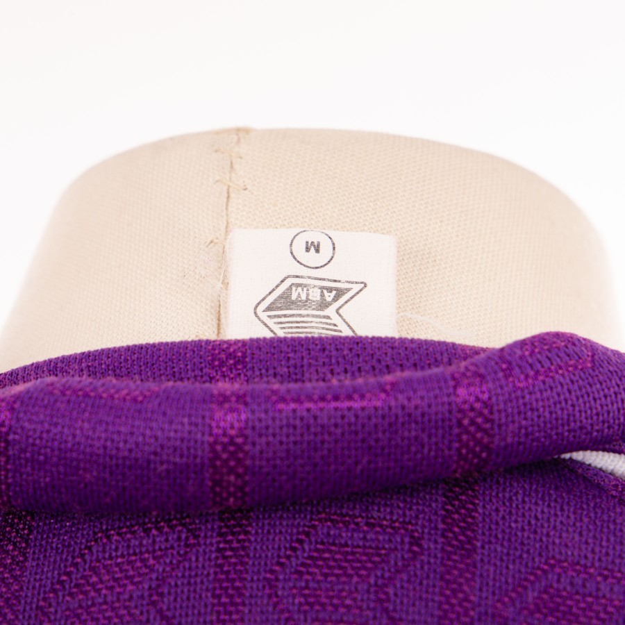 Lo stato del prodotto risulta chiarissimo dalle foto che lo riguardano. La maglia è a maniche lunghe ed è totalmente viola, a parte i polsini delle maniche che sono bianchi con delle piccole strisce verticali nere e viola, e una parte del colletto che presenta le stesse realizzazioni stilistiche e cromatiche che si trovano sulle maniche; giallo invece è il colore, floccato, dello sponsor commerciale LA NAZIONE; sopra questo, sulla sinistra, è cucito il logo del club gigliato, mentre dalla parte opposta a esser cucito è il logo dello sponsor tecnico, ABM.
