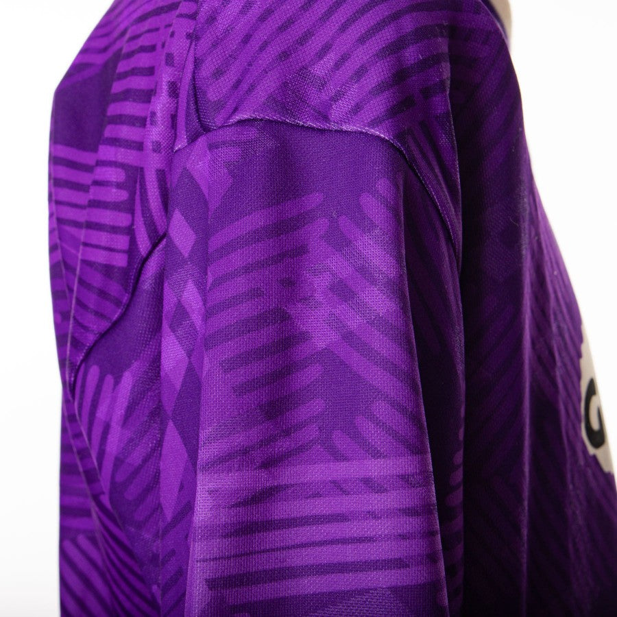 Versione home della maglia Fiorentina, utilizzata per il campionato 1991/1992. Modello a manica corta con collo a polo e bordo manica in maglieria. Colore viola e dettagli in bianco. Tutte le applicazioni sono in sublimatica. Sul fronte patch del Club, logo Lotto e sponsor commerciale Giocheria. Sul retro il numero 7.