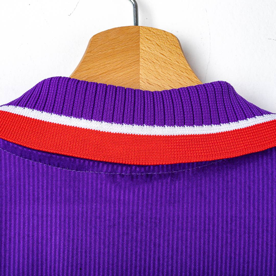 Maglia home dell’ACF Fiorentina stagione 1996/1997, prodotta da Reebok. Iconico modello di colore viola con trama tono su tono e colletto a polo con dettagli bianco e rosso. Sul fronte sono applicati lo sponsor Sammontana in stampa, il logo Reebok ricamato e lo stemma ACF Fiorentina cucito lato cuore. Sul retro è presente la personalizzazione Batistuta 9, con nome e numero applicati in stampa floccata. Patch interna Reebok A.C. Fiorentina cucita sul fondo. Tessuto tecnico in poliestere.
