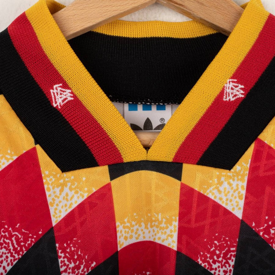 Maglia ufficiale home della Germania prodotta da Adidas per la stagione 1994, con personalizzazione Lothar Matthäus n.10. Modello iconico con design a rombi nei colori della bandiera tedesca (nero, rosso e giallo) sul petto e sulle maniche. Logo Adidas ricamato lato destro e stemma DFB cucito lato cuore in nero. Numero 10 e nome “MATTHÄUS” applicati sul retro in nero.