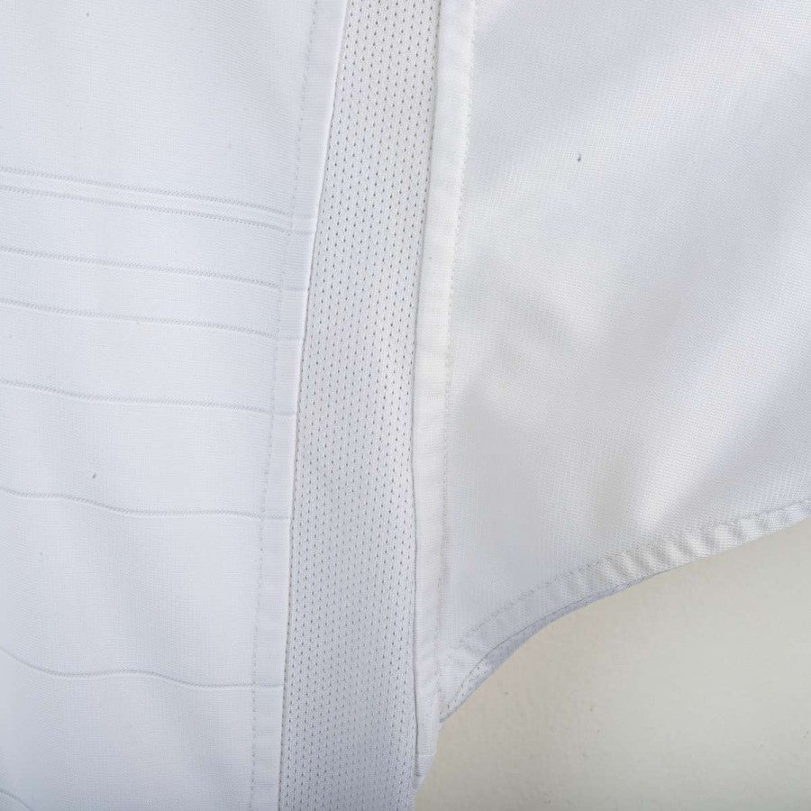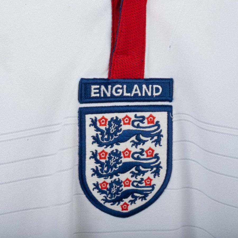 Maglia home dell'Inghilterra utilizzata nella stagione 2004, prodotta da Umbro. Classica colorazione bianca con inserti rossi sulle spalle e dettagli blu su colletto e maniche. Logo Umbro ricamato sul petto, stemma della nazionale inglese cucito lato cuore. Numero 7 e nome Beckham applicati sul retro. Vestibilità regolare. Taglia L.