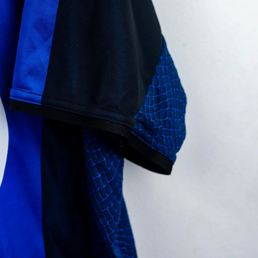 Maglia Home ufficiale dell'Inter per la stagione 2001/2002, prodotta da Nike e personalizzata con il nome Adriano e il numero 28. Questa maglia, dal classico design nerazzurro, è arricchita da dettagli gialli lungo i bordi e presenta il logo Nike ricamato sul petto accanto allo stemma dell'Inter con la stella dorata. Lo sponsor commerciale Pirelli è ben visibile al centro, conferendo al capo un aspetto iconico. Realizzata in tessuto leggero e traspirante, la maglia è di taglia XL, perfetta per i tifosi e i collezionisti che vogliono celebrare l'inizio della carriera italiana di Adriano, il celebre "Imperatore".