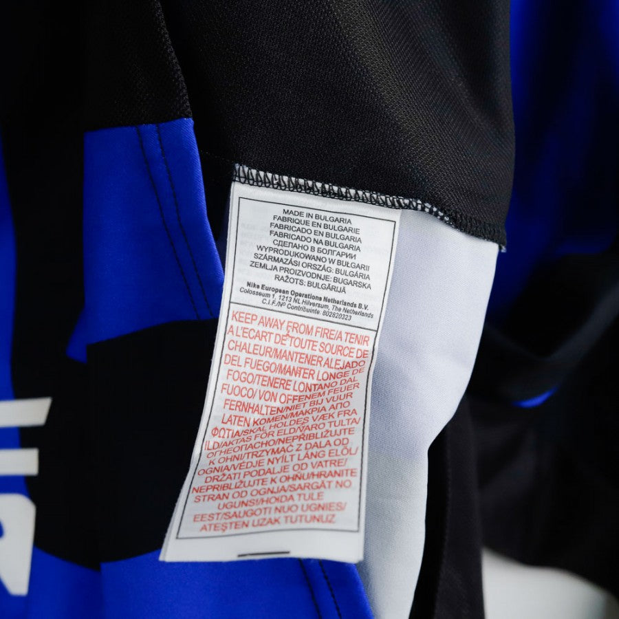 Maglia home dell'Inter per la stagione 2002/2003, realizzata da Nike. Presenta il classico design a strisce nerazzurre con dettagli gialli, il logo Nike, lo stemma dell'Inter e lo sponsor Pirelli sulla parte frontale. Sul retro sono presenti il nome e il numero 13 di Fabio Cannavaro. La maglia è dotata della patch della Lega Calcio sulla manica. Taglia L.
