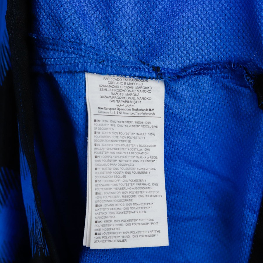 Maglia home dell'Inter per la stagione 2010/2011, realizzata dallo sponsor tecnico Nike. Il design presenta le classiche strisce nerazzurre con un motivo grafico a zig-zag. Lo stemma dell'Inter è posizionato sul petto con la stella sopra, mentre il logo Nike si trova sul lato opposto. Lo sponsor commerciale Pirelli è ben visibile al centro. La maglia è personalizzata con il nome "Eto'o" e il numero 9 sul retro, con la patch della Serie A TIM sulla manica. La taglia della maglia è L.