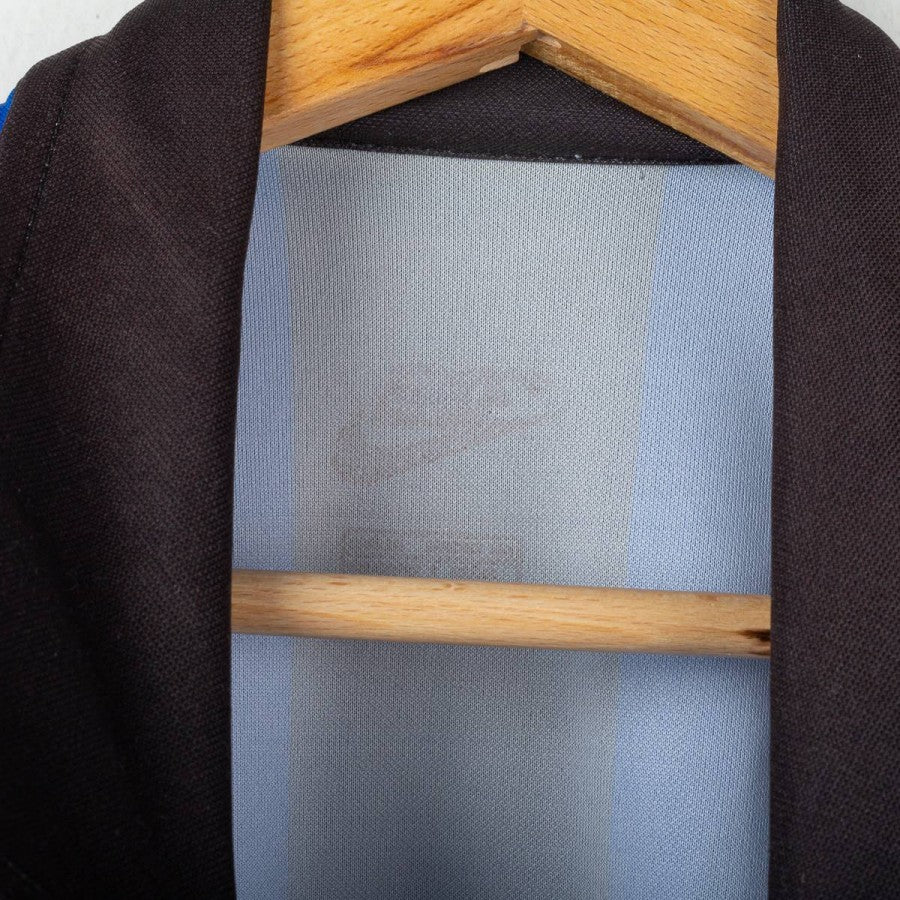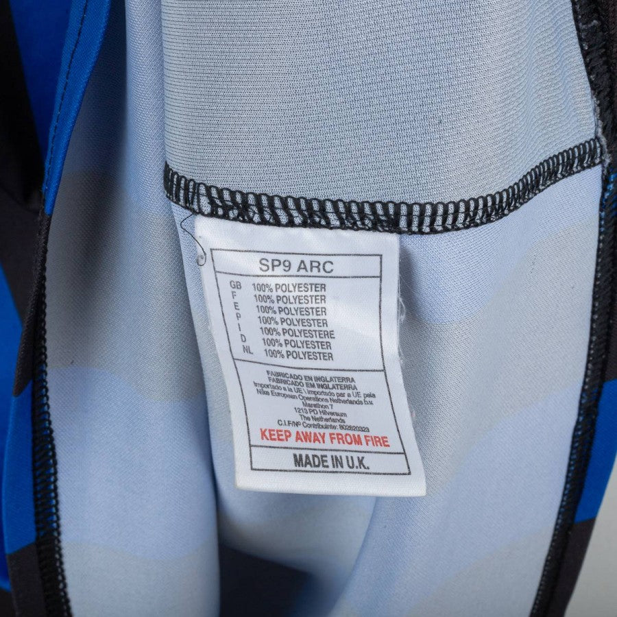 Maglia home dell'Inter utilizzata nella stagione 1998/1999, prodotta da Nike. Classiche strisce nerazzurre con inserti laterali in mesh. Stemma societario cucito lato cuore con stella superiore. Logo Nike ricamato sul petto. Sponsor Pirelli applicato in flock bianco. Nome “RONALDO” e numero 9 stampati sul retro in bianco con bordo nero. Colletto a polo con scollo a V. Tecnologia NikeFit. Taglia XL.