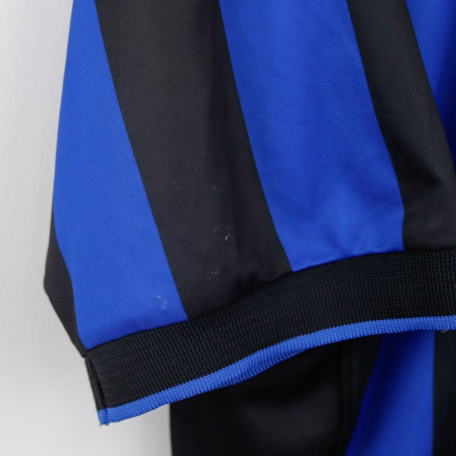Maglia home ufficiale dell'Inter per la stagione 1998/1999, prodotta dallo sponsor tecnico Nike. Il design presenta le classiche strisce nerazzurre, con un elegante colletto a polo nero e dettagli in blu. Sul petto sono ricamati il logo Nike e lo stemma del club con la stella, mentre al centro campeggia lo sponsor commerciale Pirelli. Sul retro, la maglia è personalizzata con il nome di Ronaldo e il numero 9, simbolo del fenomeno brasiliano. La maglia è disponibile nella taglia L.