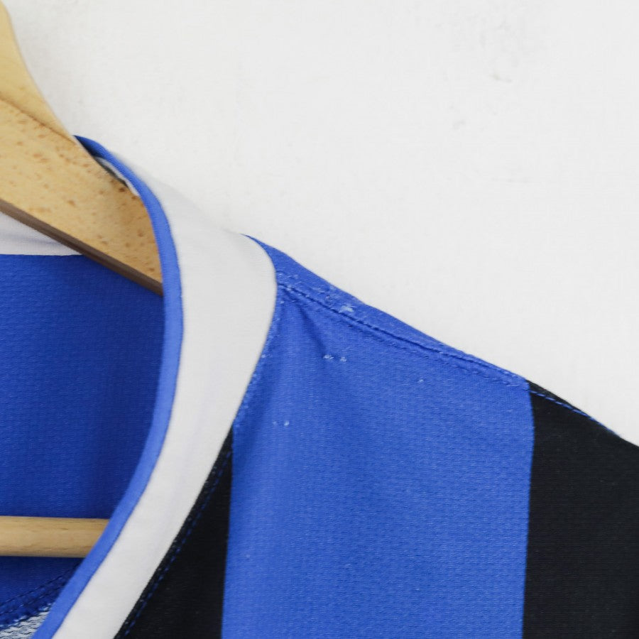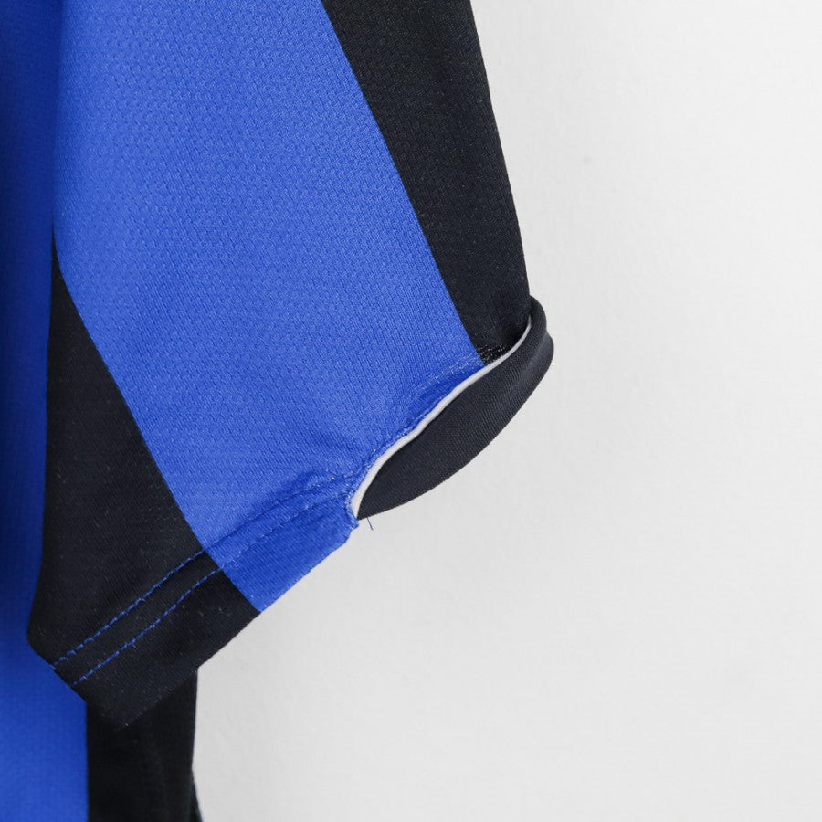Maglia Home dell'Inter stagione 2006/2007, realizzata da Nike. Le classiche strisce verticali nerazzurre sono abbinate a un colletto a V rifinito in bianco e azzurro. Lo swoosh Nike è presente come sponsor tecnico e sul petto compare lo stemma tricolore da campioni d'Italia, insieme allo scudetto del club e allo sponsor commerciale in caratteri cinesi. Sul retro sono applicati il nome Stankovic e il numero 5 in bianco. Taglia non visibile.