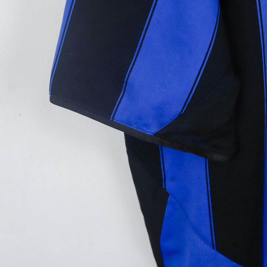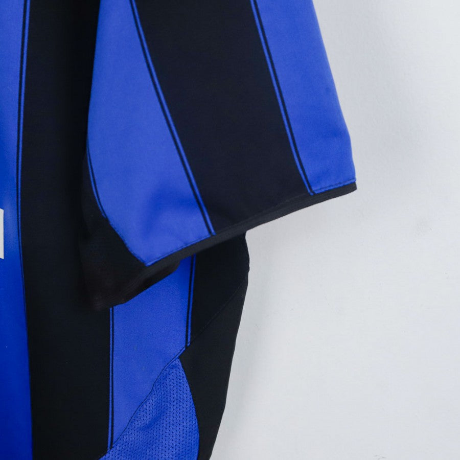 Maglia Home ufficiale dell'Inter per la stagione 2003/2004, realizzata dallo sponsor tecnico Nike e personalizzata con il nome e il numero 32 di Christian Vieri. Il design classico presenta le tradizionali strisce nerazzurre, con il logo Nike ricamato sul petto e lo stemma dell'Inter con la stella applicato lato cuore. Lo sponsor commerciale Pirelli è stampato frontalmente, mentre sul retro compaiono il nome "Vieri" e il numero 32 in bianco. Modello in tessuto tecnico traspirante, pensato per garantire il massimo comfort ai giocatori.