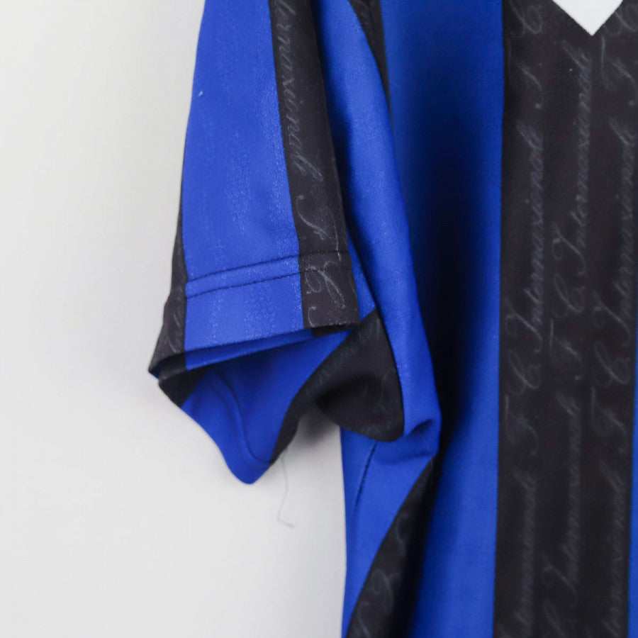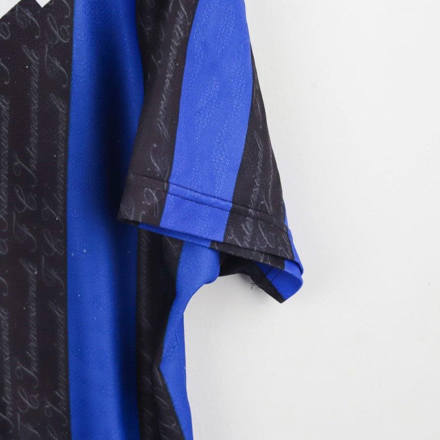 Maglia ufficiale home dell'Inter per la stagione 1996/1997, prodotta dallo sponsor tecnico Umbro. La maglia presenta le tradizionali strisce verticali nerazzurre, con colletto a polo nero e chiusura a due bottoni. Sul petto, a destra, è ricamato il logo Umbro in giallo, mentre sul lato sinistro si trova lo stemma del club, sovrastato dalla stella dorata. Al centro della maglia campeggia lo sponsor commerciale "Pirelli" in bianco. Sul retro sono applicati il nome "Djorkaeff" e il numero 6 in bianco. La maglia è a maniche lunghe con polsini elasticizzati. La taglia indicata è M.