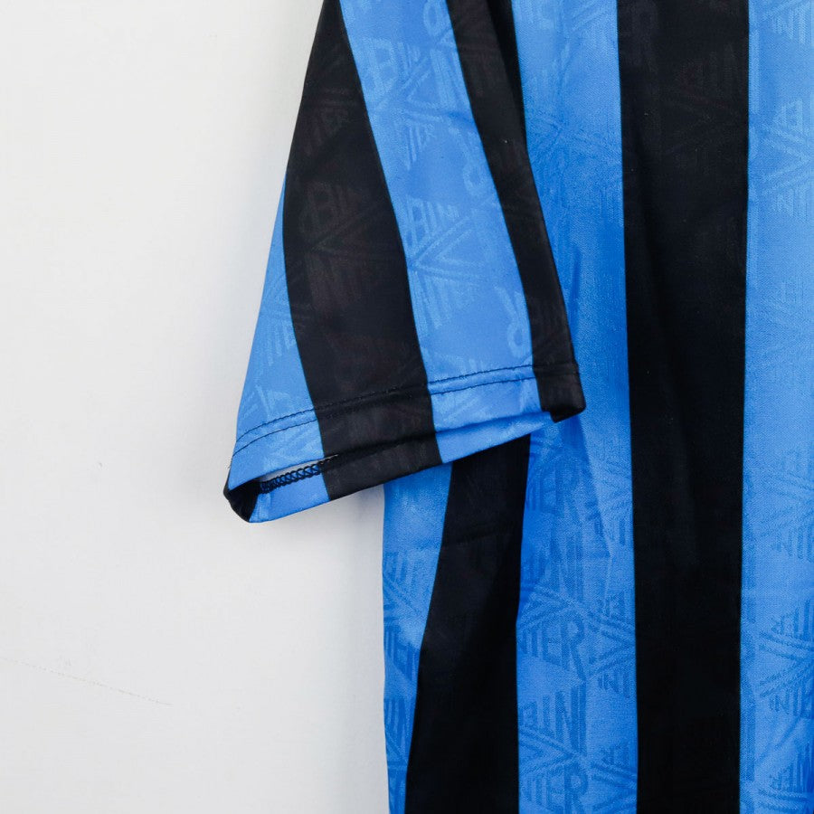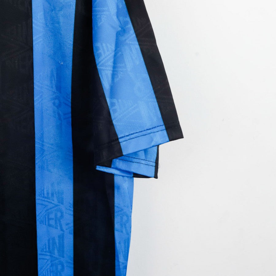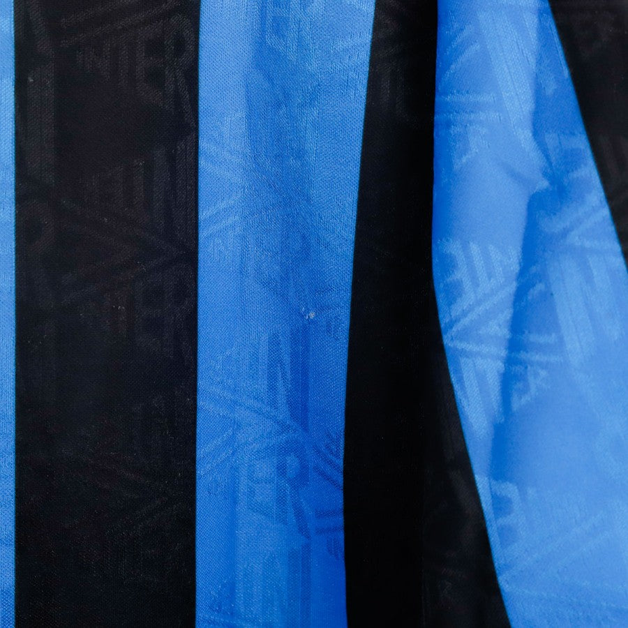 Maglia ufficiale dell'Inter realizzata da Umbro per la stagione 1991/1992. Modello home a righe nerazzurre con sponsor Fitgar e logo Umbro applicati in giallo. Stemma del club cucito lato cuore, colletto nero con dettagli azzurri. Fantasia con scritta "Inter" tono su tono. Taglia XL.