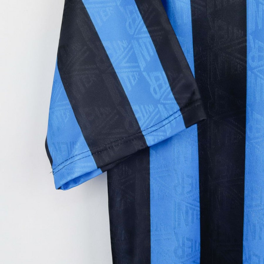 Maglia home ufficiale dell'Inter per la stagione 1991/1992, prodotta dallo sponsor tecnico Umbro. La divisa presenta il classico design a strisce nerazzurre con una trama geometrica che include la sigla "Inter" ripetuta su tutto il tessuto. Il colletto è nero con chiusura a bottone, mentre sul petto sono ricamati lo stemma dell'Inter con la stella dorata e il logo Umbro. Lo sponsor commerciale Fitgar è stampato in bianco al centro della maglia, completando il look iconico di questa storica stagione.