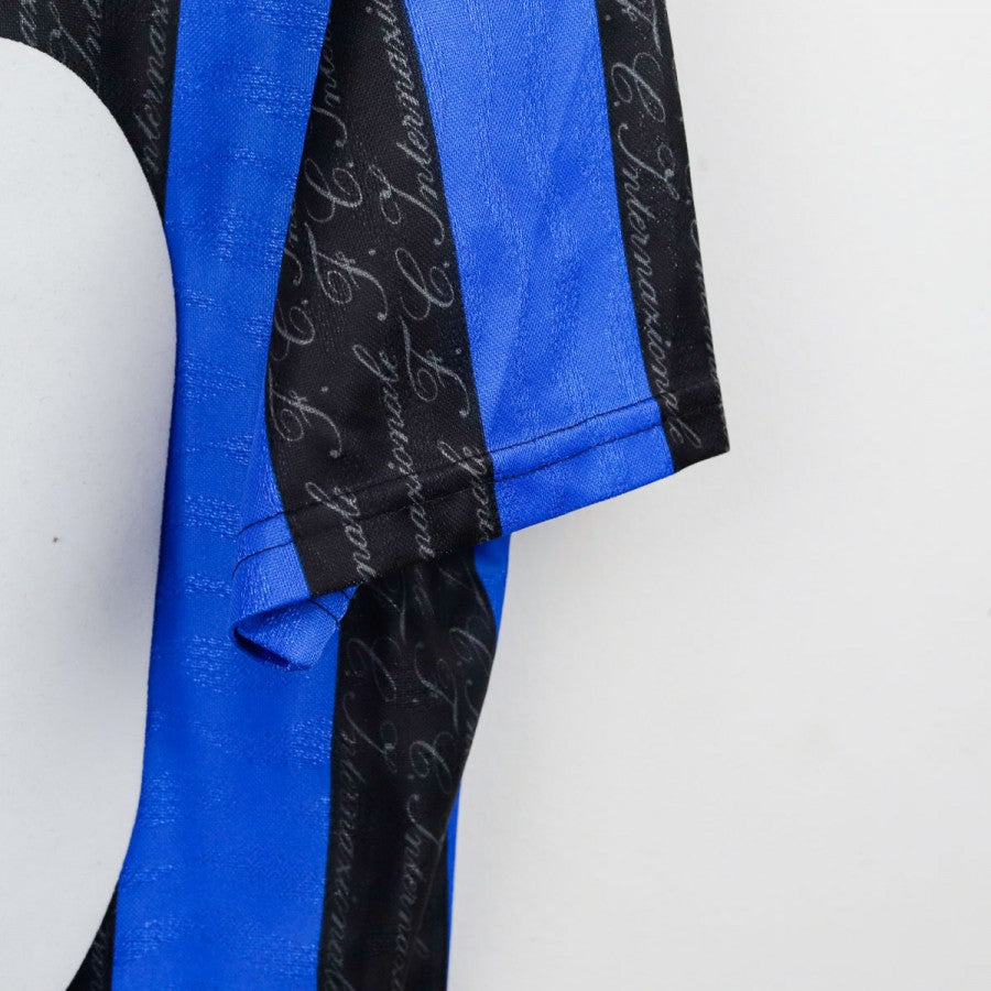 Iconica maglia casalinga dell'Inter stagione 1997/1998, firmata Umbro con le classiche strisce nerazzurre verticali. Lo sponsor tecnico Umbro è presente sia sul fronte che sul retro, mentre lo sponsor commerciale Pirelli domina il centro della divisa. Sul retro è applicato il numero 10 con il nome “Ronaldo”, celebrando l'arrivo del Fenomeno in nerazzurro. Taglia M.