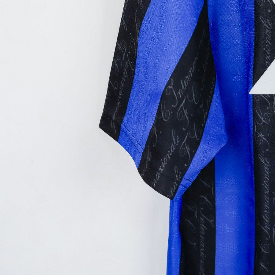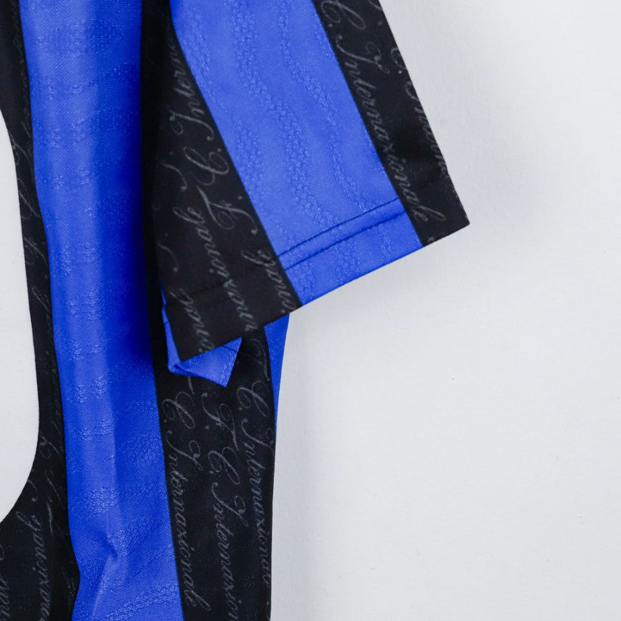 Maglia home dell'Inter stagione 1997/1998, realizzata da Umbro. Caratterizzata dalle classiche strisce nerazzurre, questa maglia presenta dettagli unici come il motivo con la firma "Internazionale" ripetuta in verticale sulle strisce nere. Il logo Umbro e lo stemma dell'Inter sono cuciti, mentre lo sponsor Pirelli è stampato in bianco. Sul retro, il nome e il numero 10 di Ronaldo, simbolo di una stagione memorabile. Taglia M.