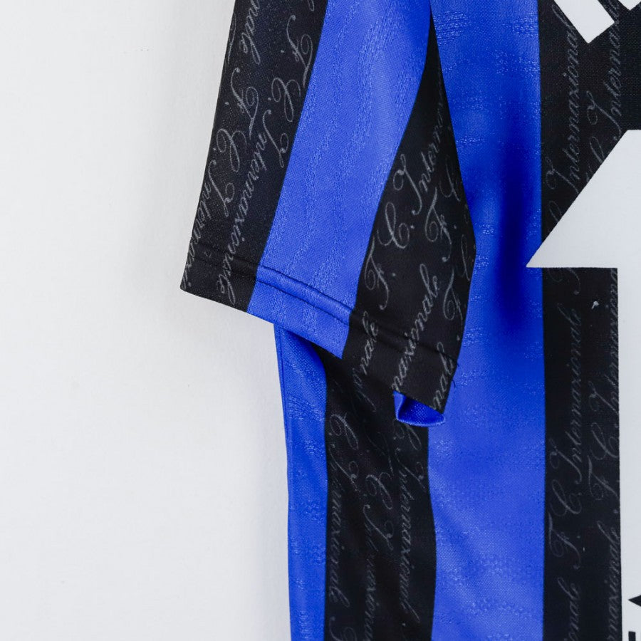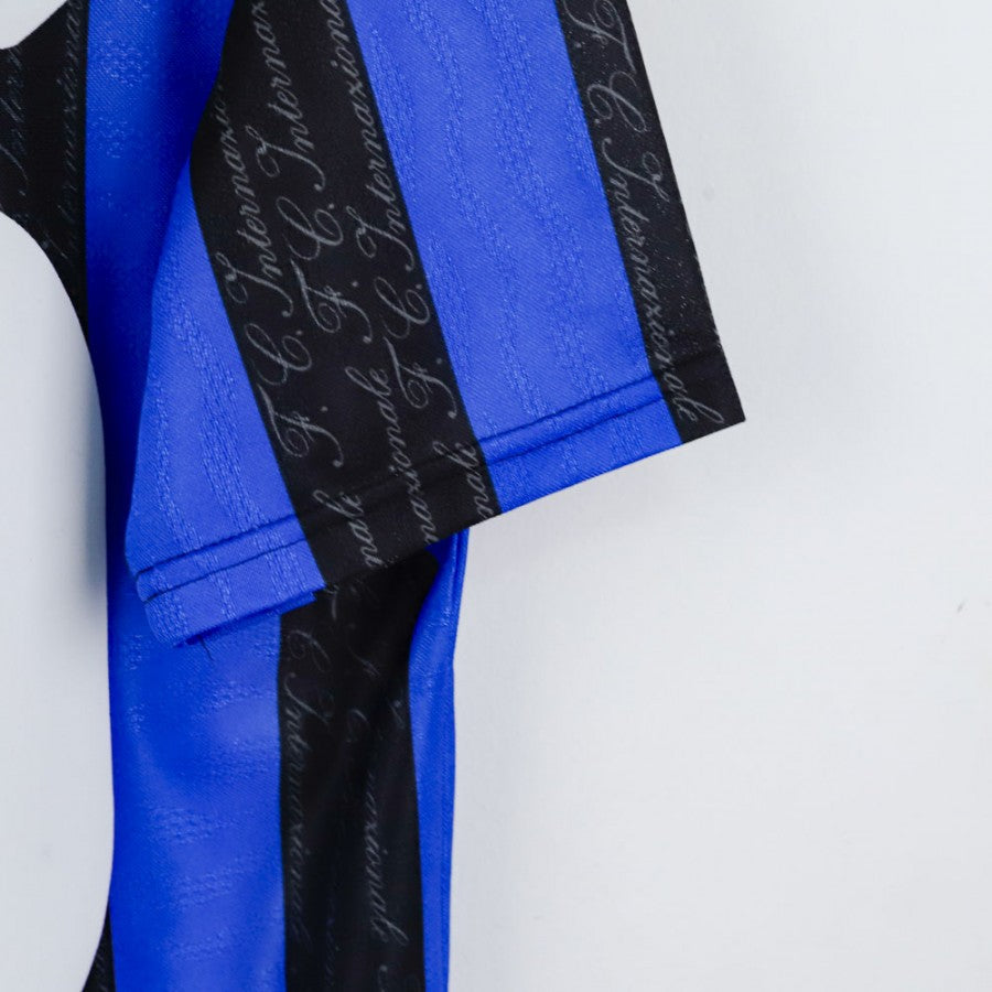 Maglia home ufficiale dell'Inter per la stagione 1997/1998, prodotta da Umbro e personalizzata con il nome "Ronaldo" e il numero 10 sul retro, taglia M. La maglia presenta le classiche strisce nerazzurre, con il logo Umbro ricamato in bianco sul petto accanto allo stemma dell'Inter, sovrastato dalla stella dorata. Al centro, in bianco, campeggia il celebre sponsor commerciale "Pirelli". Questo modello si distingue per la texture con il logo Umbro impresso su tutte le strisce nere, rendendola particolarmente ricercata tra i collezionisti.