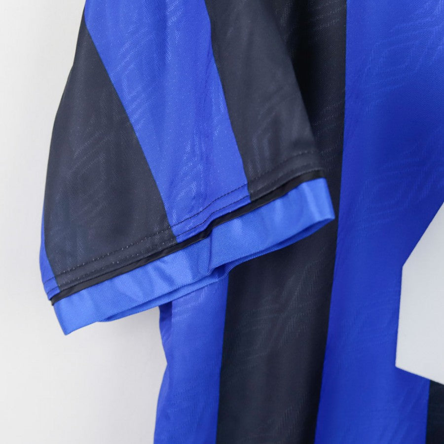 Maglia Home ufficiale dell'Inter per la stagione 1995/1996, realizzata dallo sponsor tecnico Umbro. Il design classico nerazzurro presenta le iconiche strisce verticali nere e blu con una trama jacquard, arricchita dal colletto a polo. Lo stemma del club è cucito sul lato cuore, mentre il logo Umbro è ricamato sul petto. Lo sponsor commerciale Pirelli campeggia al centro della maglia, rendendo questo modello un'icona della metà degli anni '90. Sul retro è personalizzata con il nome Zanetti e il numero 4. Taglia L.
