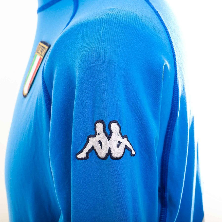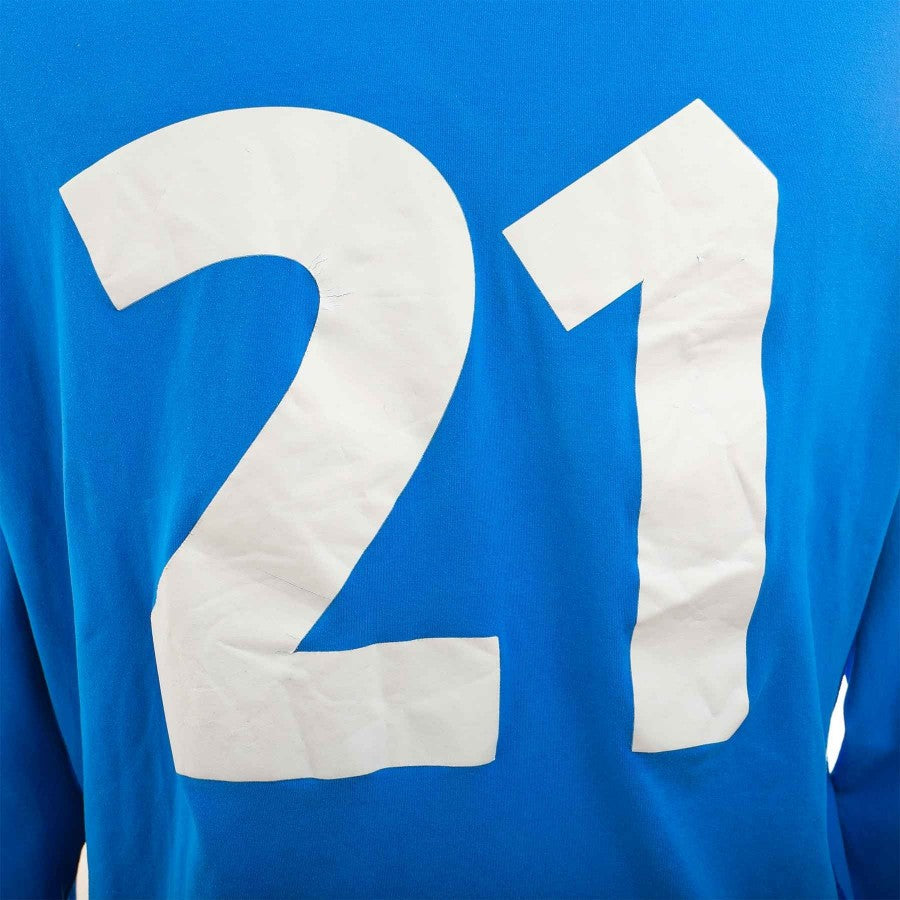 Maglia da gara dell'Italia a maniche lunghe di colore azzurro per Euro 2000. Numero 21 applicato in piccolo sul petto e in grande sul retro. Logo Italia cucito lato cuore, loghi Kappa ricamati sulle maniche, Tre stelline Mondiali ricamate sulla manica destra.
