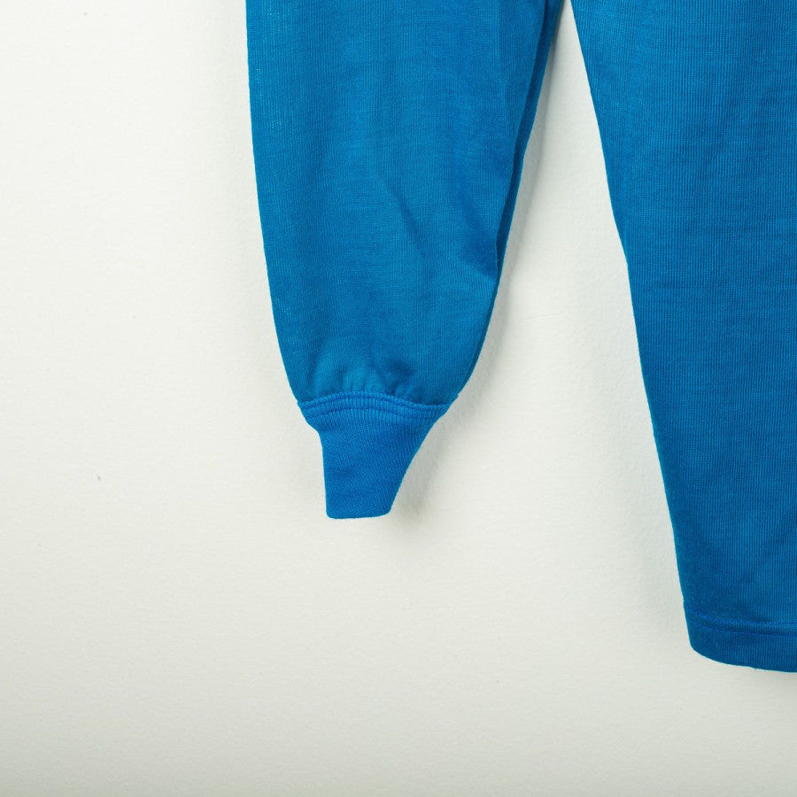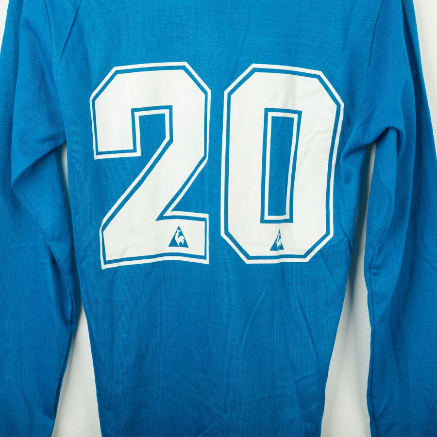 Maglia home dell'Italia utilizzata durante la stagione 1982, prodotta da Le Coq Sportif. Iconico modello azzurro a maniche lunghe con colletto a V rifinito nei colori della bandiera italiana. Logo Le Coq Sportif stampato sul petto destro e stemma Italia con tricolore applicato lato cuore. Numero 20 stampato sul retro in bianco con bordi azzurri, come nella storica divisa di Rossi ai Mondiali di Spagna. Tessuto in cotone leggero, vestibilità regolare. Taglia 3.