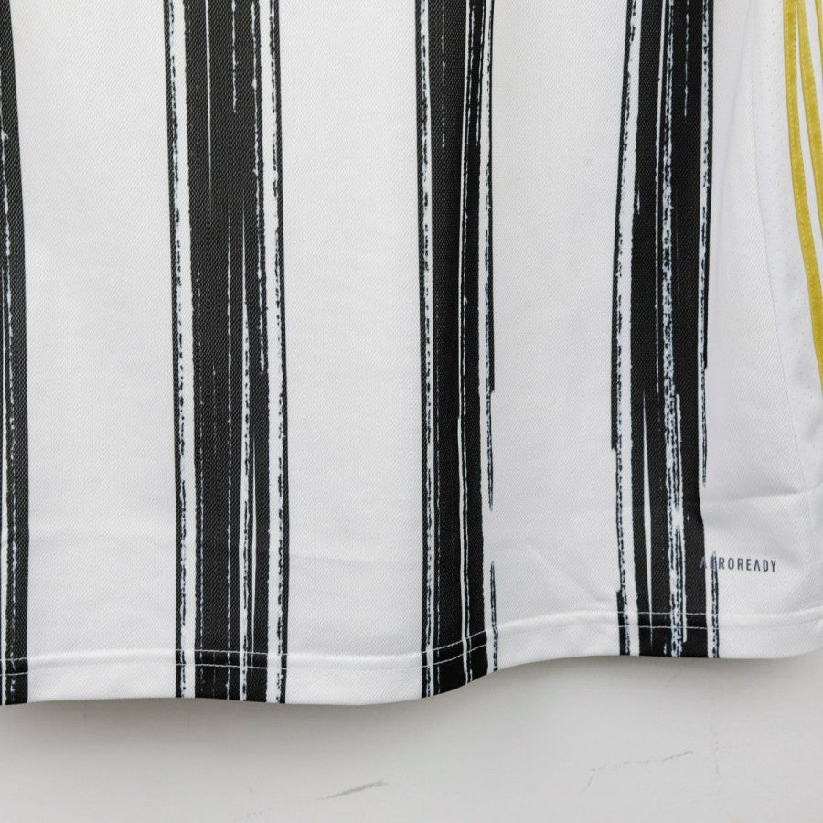 Maglia Home Juventus Adidas 2020/2021. Realizzata dal brand tedesco Adidas, presenta lo sponsor tecnico sul petto in oro, affiancato dal logo Juventus con le tre stelle. Lo sponsor commerciale "Jeep" campeggia centralmente. La maglia si distingue per le classiche strisce bianconere rivisitate in chiave artistica, con effetto pennellata. Le tre strisce Adidas lungo i fianchi sono dorate, a richiamare la palette elegante della stagione.