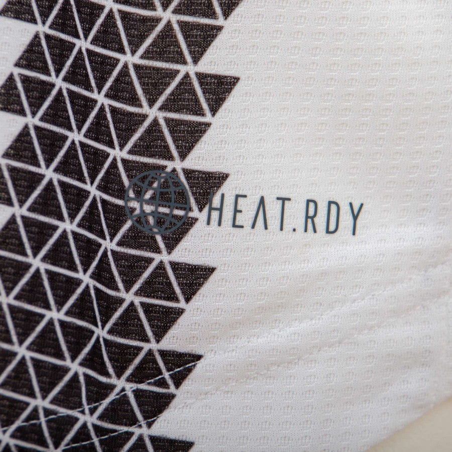 La maglia a maniche corte si distingue per le strisce verticali bianche e nere con un suggestivo pattern geometrico. Le inconfondibili bande Adidas adornano le spalle e il logo del fornitore è elegantemente collocato sul lato destro. L'emblema della Juventus con le tre stelle dorate è fieramente posizionato sul cuore, al di sotto troviamo lo sponsor commerciale Jeep.