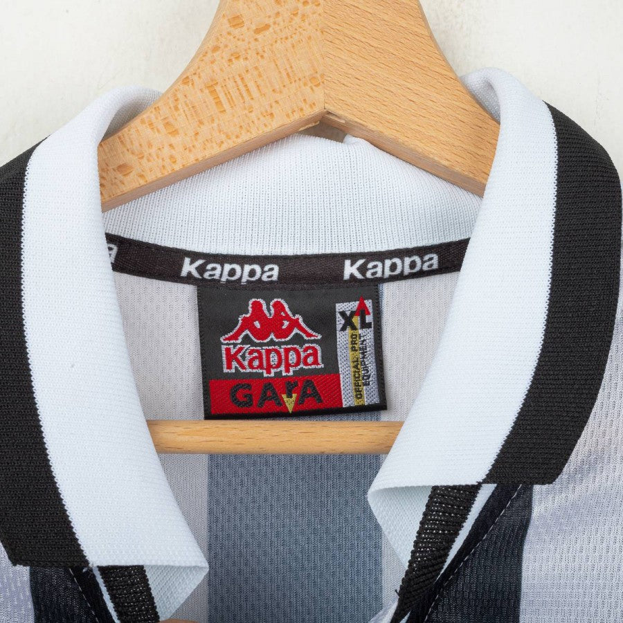 Maglia Juventus indossata per la Coppa Intercontinentale 1996, prodotta da Kappa. Modello home a righe bianconere con colletto nero e bianco. Logo Kappa ricamato sul petto, doppia stella cucita lato cuore e patch celebrativa “European South American Cup 1996” stampata sulla manica. Retro con nome Del Piero 10 in flock e loghi Kappa alla base del numero. Vestibilità ampia a maniche lunghe con polsini elasticizzati. Taglia XL. Prodotto originale Kappa, sponsor tecnico Juventus.