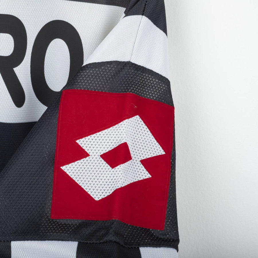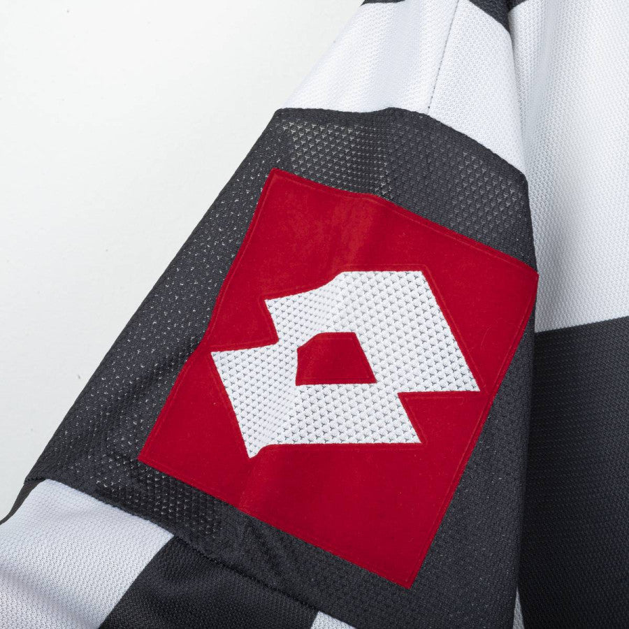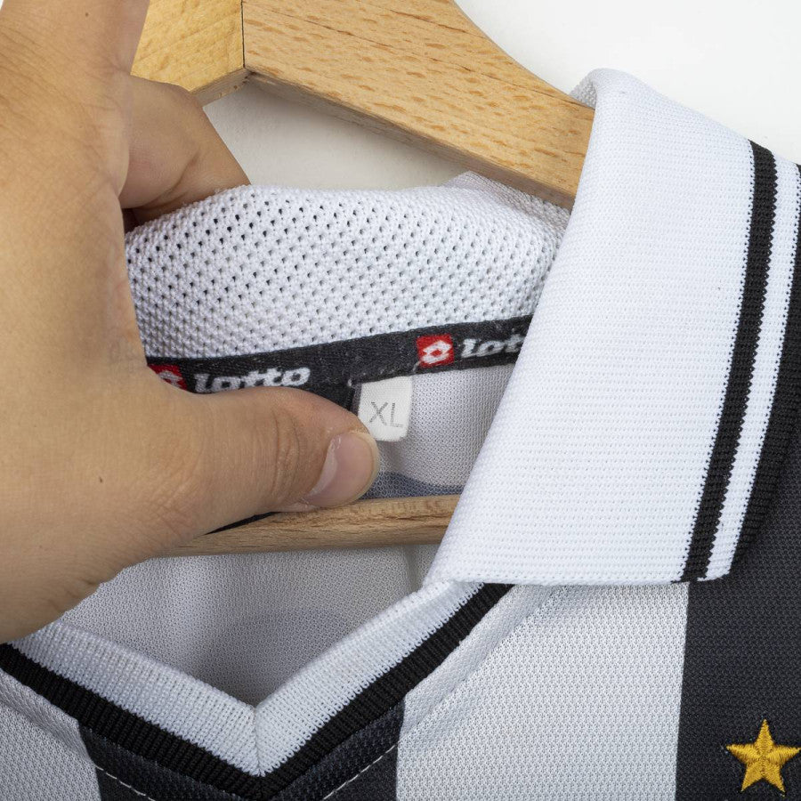 Maglia home della Juventus indossata nella stagione 2001/2002 in Champions League, prodotta da Lotto. Classiche strisce bianconere con colletto polo bianco e dettagli neri. Stemma Juventus cucito lato cuore con due stelle ricamate in oro. Logo Lotto cucito lato destro e applicato in patch sulle maniche. Sponsor TU Mobile applicato in stampa gommata rossa con stella verde. Nome Del Piero e numero 10 applicati in nero sul retro. Vestibilità regolare. Taglia XL.