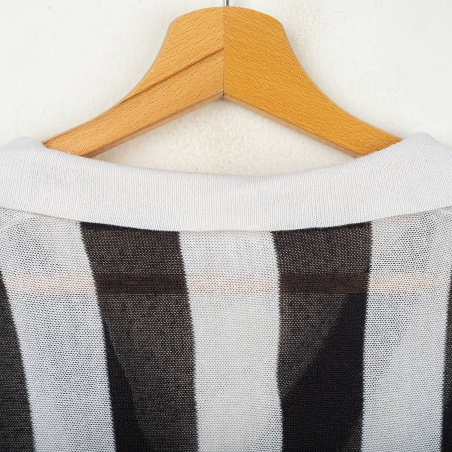 Maglia ufficiale home della Juventus, stagione 1982/1983, prodotta da Kappa. Storico modello a maniche lunghe con classiche strisce verticali bianconere, realizzato in tessuto leggero e traspirante tipico dell'epoca. Logo Kappa ricamato sul petto destro, due stelle ricamate lato cuore. Colletto a polo bianco. Modello senza sponsor, fedele alle divise storiche del club in quegli anni. Taglia 52 (corrispondente a L/XL). Made in Italy.