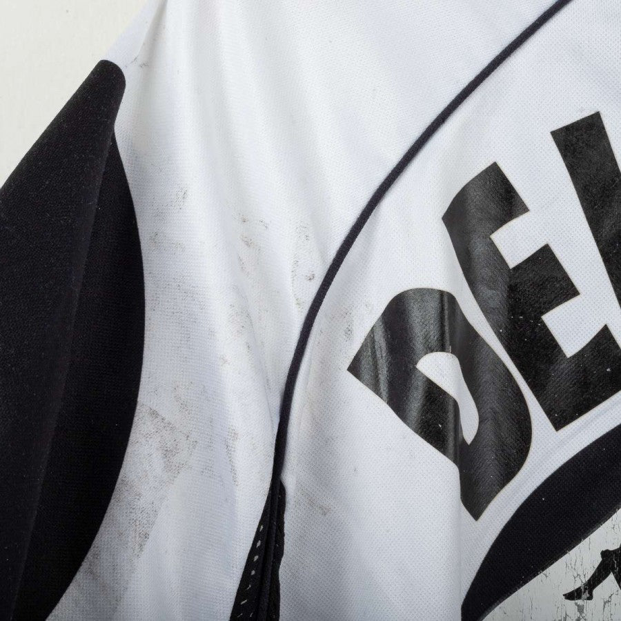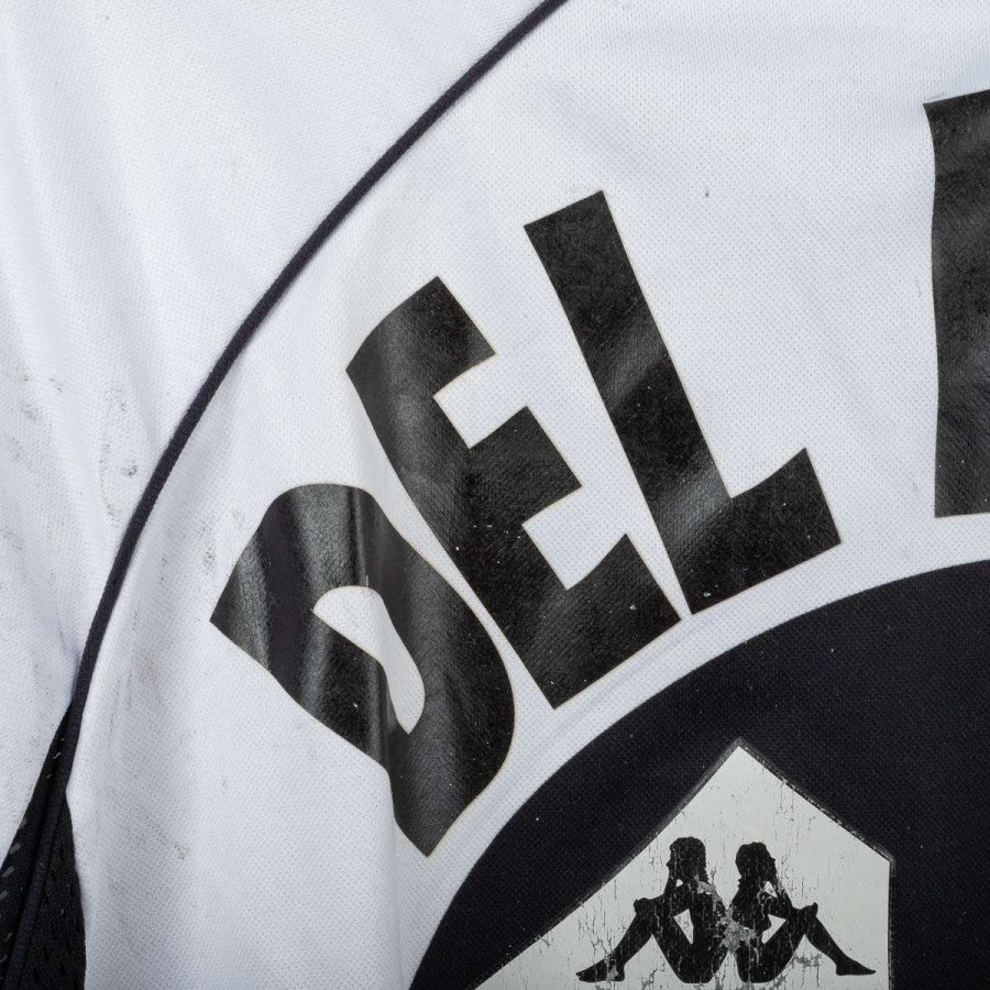 Maglia home della Juventus indossata nella stagione 1997/1998, prodotta da Kappa. Design a strisce verticali bianche e nere, con inserti in mesh neri sui fianchi. Logo Kappa ricamato in bianco sul petto destro, stemma Juventus con due stelle ricamato sulla manica sinistra. Sponsor “Sony MiniDisc” stampato sul fronte. Nome “Del Piero” e numero 10 applicati sul retro, con loghi Kappa all'interno dei numeri. Colletto nero con inserti bianchi. Vestibilità regolare, maniche corte. Taglia L.