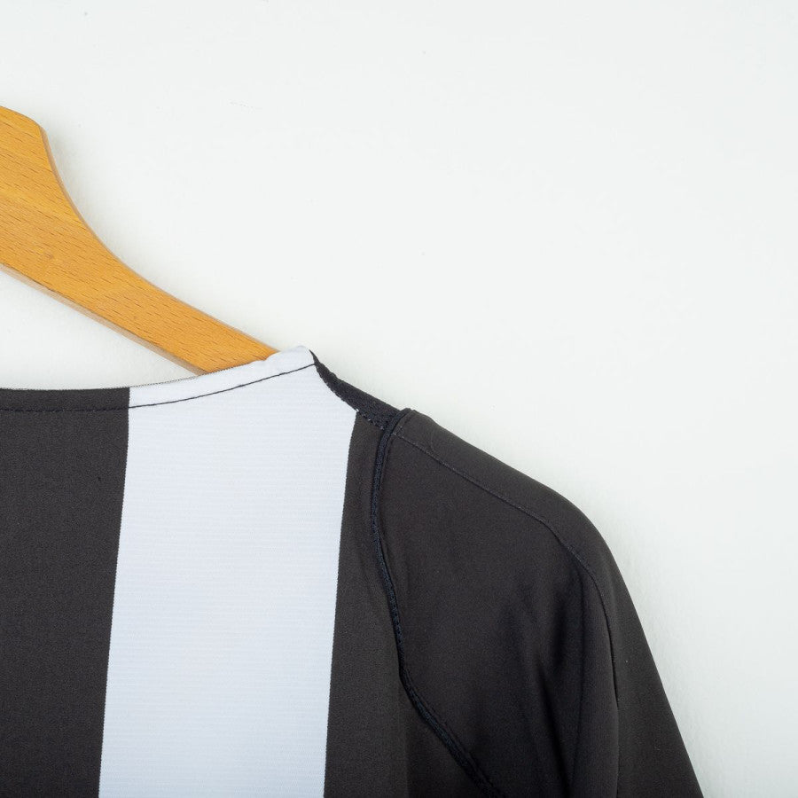 Maglia home della Juventus utilizzata nella stagione 2004/2005, prodotta da Nike. Classico design a strisce verticali bianche e nere, con inserti laterali in mesh bianco. Logo Nike cucito in giallo sul petto destro, stemma della Juventus cucito lato cuore con due stelle ricamate sopra. Sponsor Sky Sport applicato in stampa giallo e blu. Colletto a V nero con profilo bianco, interno collo con logo 90. Tessuto tecnico Dri-Fit in poliestere leggero e traspirante. Vestibilità regolare. Taglia L.