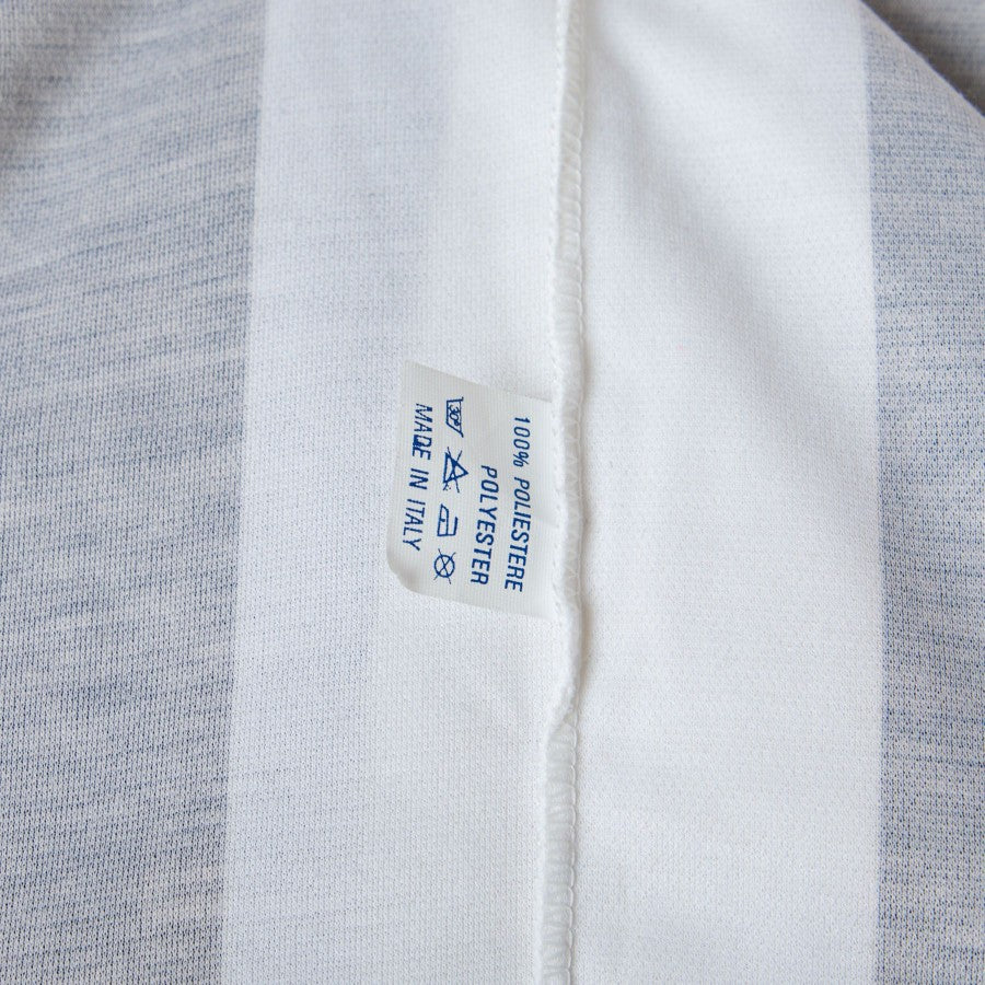 Modello con strisce verticali bianconere, a manica lunga con polsini e colletto a polo. Tutte le applicazioni sono in sublimatica.