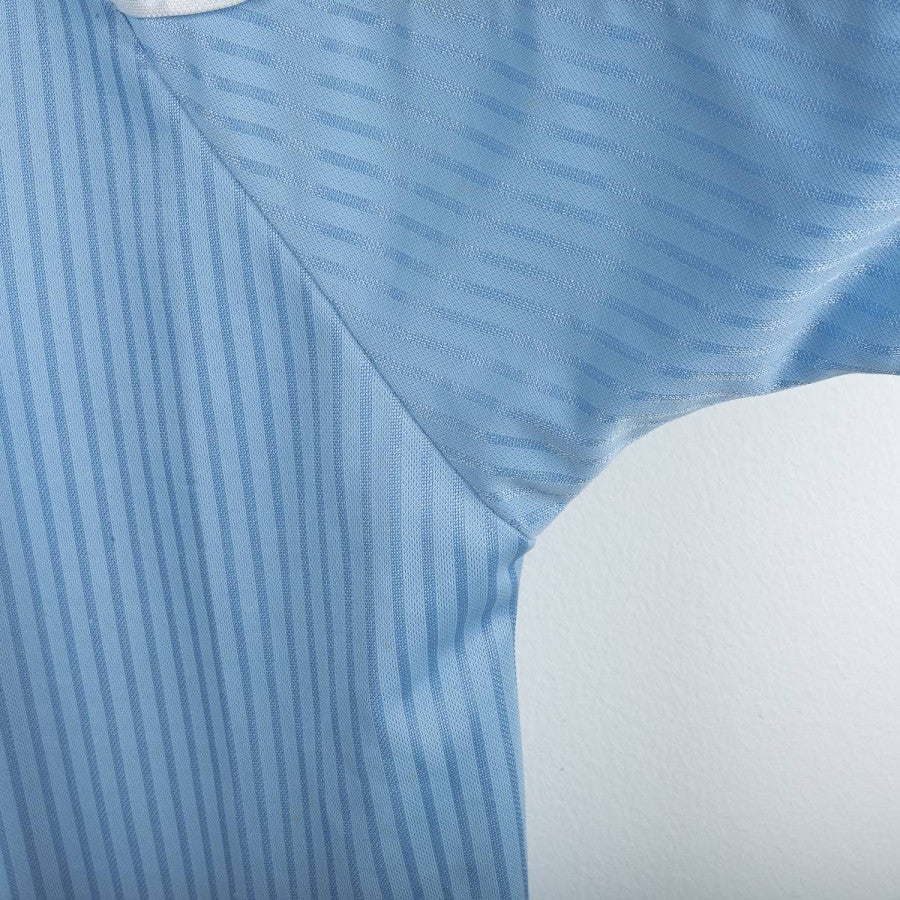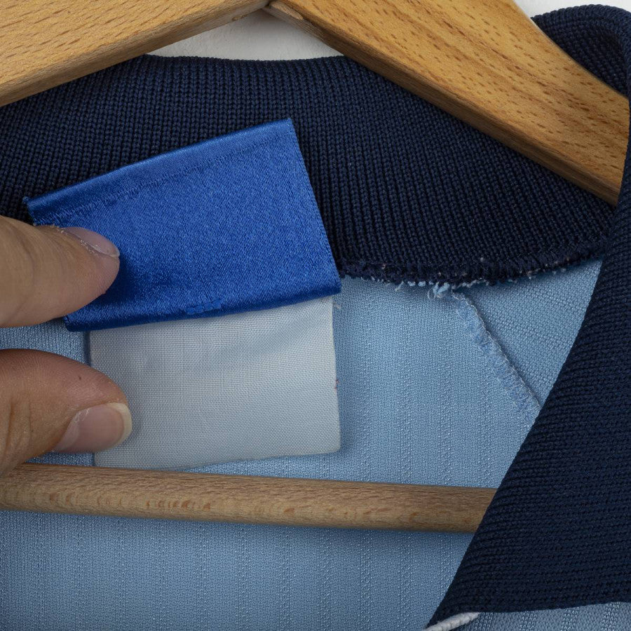 Maglia home della Lazio indossata nella stagione 1997/1998, prodotta da Umbro. Classica colorazione celeste con colletto polo blu navy e dettagli bianchi. Stemma Lazio cucito lato cuore e logo Umbro ricamato lato destro. Sponsor centrale applicato in flock, con motivo tono su tono del logo societario sul tessuto. Nome e numero 13 applicati sul retro in stampa blu navy. Dettaglio "S.S. Lazio" ricamato all'interno del colletto. Vestibilità regolare. Taglia XL.