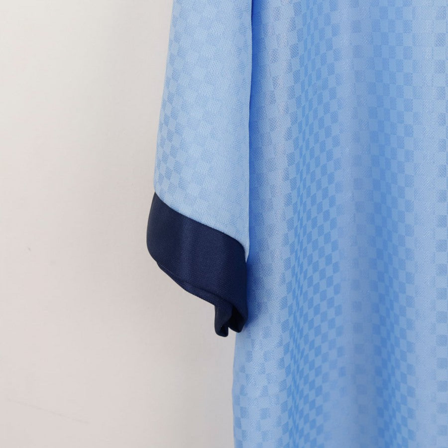 Maglia Home ufficiale della Lazio per la stagione 1995/1996, personalizzata con il nome e il numero 11 di Giuseppe Signori. Modello a maniche corte, dal classico colore celeste con dettagli blu su colletto e bordi delle maniche. Il design presenta una trama a rombi tono su tono che arricchisce il tessuto. Lo stemma della Lazio è applicato sul lato cuore, mentre il logo Umbro è posizionato sul petto. Al centro spicca lo sponsor commerciale Banca di Roma. La taglia è XL.