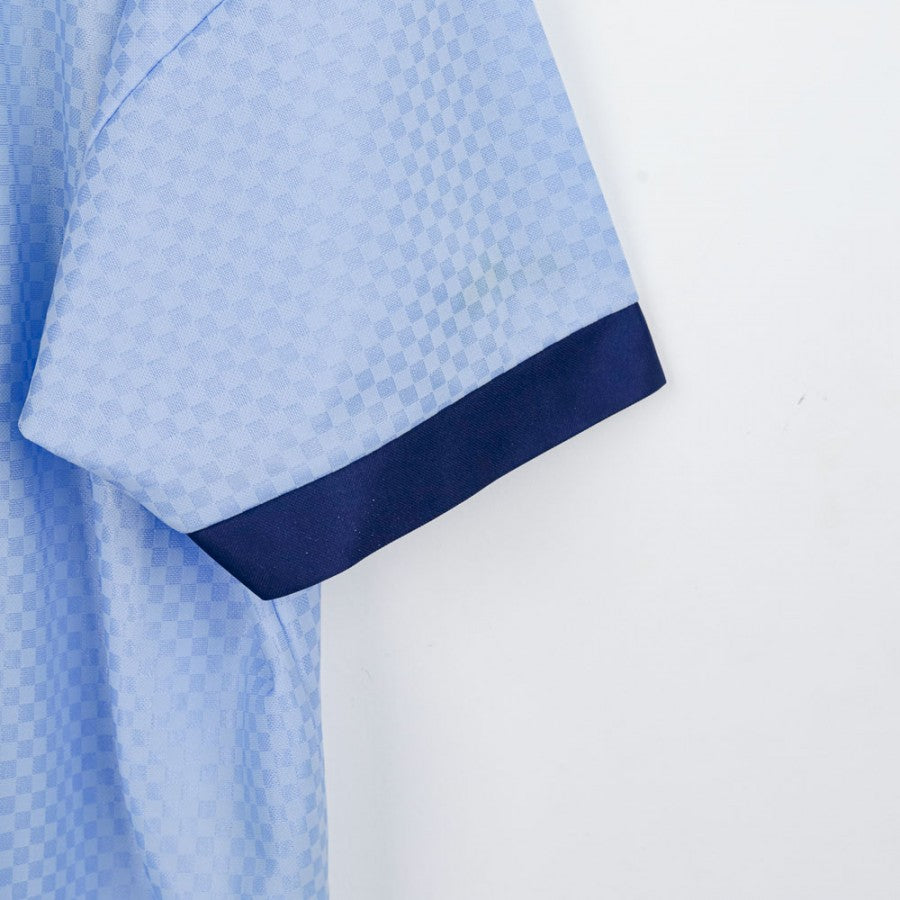 Questa maglia home ufficiale della Lazio per la stagione 1995/1996 è prodotta dallo sponsor tecnico Umbro e sponsorizzata da Banca di Roma. Caratterizzata dal classico celeste laziale, presenta un colletto blu scuro con doppia riga bianca e blu, che aggiunge un tocco di eleganza. Sul petto, a sinistra, è presente lo stemma della Lazio con l'aquila stilizzata, mentre al centro campeggia il logo Banca di Roma in nero. Sul retro della maglia è stampato il nome “Signori” con il numero 11, rendendo omaggio al leggendario attaccante Beppe Signori, noto per le sue capacità realizzative e la velocità.