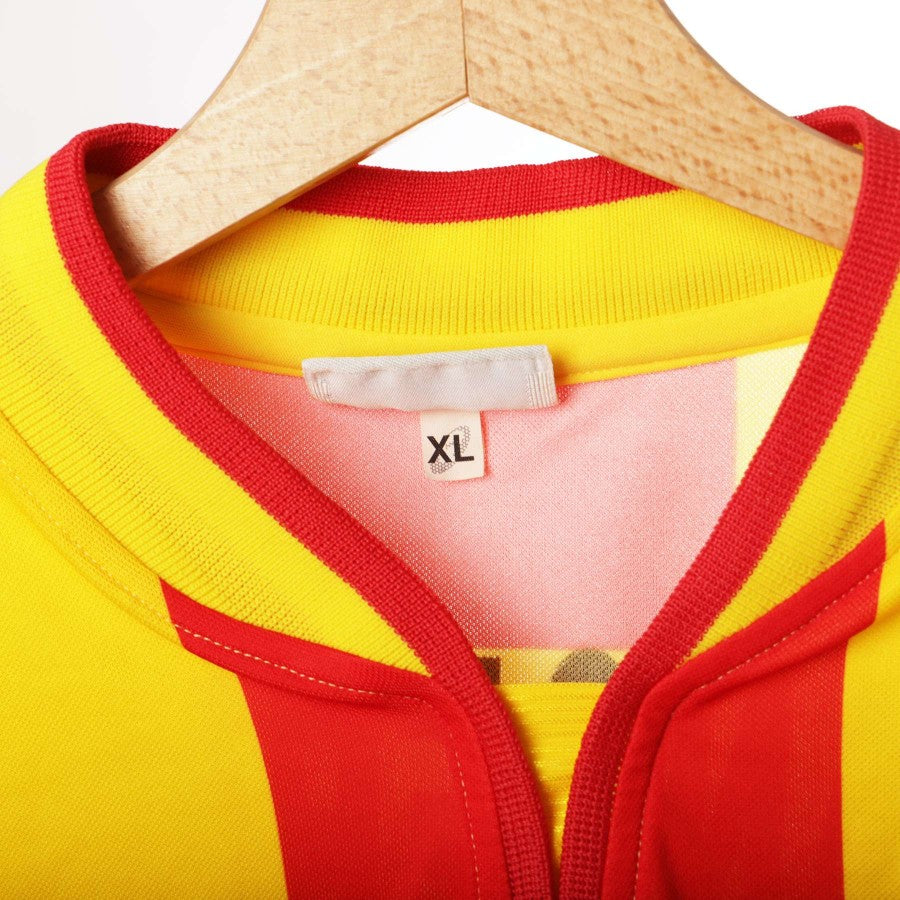 Modello home a manica lunga e scollo a V. Fantasia a righe verticali rosse e gialle. Patch della squadra applicata lato cuore e logo Asics sulla destra. Personalizzazione verniciata sul retro PIANGERELLI 4 e patch della Lega Calcio sulla manica destra. Lo sponsor commerciale è Salento d'Amare.