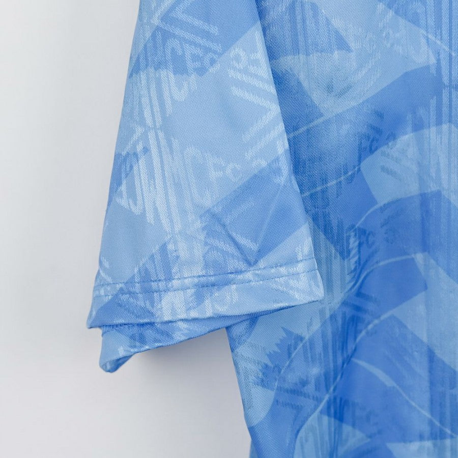 Maglia home ufficiale del Manchester City per la stagione 1992/1993, prodotta dallo sponsor tecnico Umbro. La divisa presenta il classico colore celeste con una trama geometrica che include la sigla "MCFC" ripetuta su tutto il tessuto. Il colletto a polo è rifinito in blu con dettagli bianchi, mentre sulle maniche è presente il caratteristico motivo Umbro. Sul petto è ricamato lo stemma del Manchester City e il logo Umbro, con lo sponsor commerciale Brother stampato al centro.