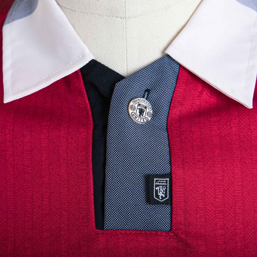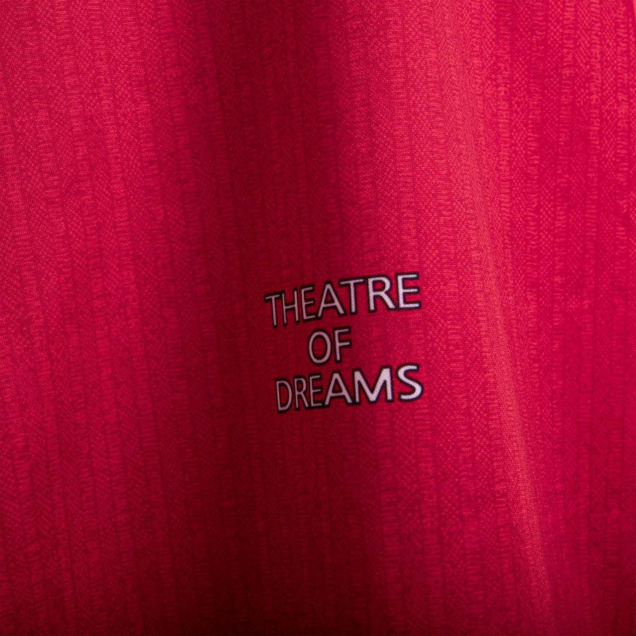 Maglia Manchester United modello Home a manica corta rossa con inserti bianchi e grigi sul colletto a polo. Sul fronte c'è il logo dello sponsor commerciale Sharp in sublimatico poco al di stotto del logo squadra cucito sul petto. Tra il colletto ed il logo squadra è nella trama il logo dello sponsor tecnico Umbro, mentre sul fondo troviamo la lettering "Theatre of dreams". In basso a destra, sul fronte, c'è il bollino di autenticità della Umbro.