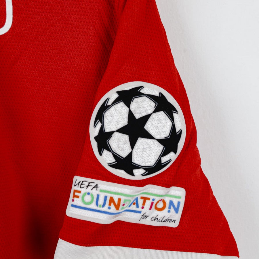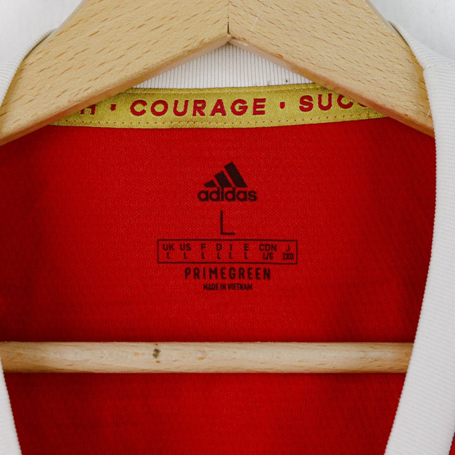 Maglia ufficiale Home del Manchester United per la stagione 2021/2022, prodotta dallo sponsor tecnico Adidas e personalizzata con il nome di Cristiano Ronaldo e il numero 7. La maglia, di taglia L, presenta un design rosso classico con dettagli bianchi su colletto e maniche, completato dalle iconiche tre strisce Adidas sulle spalle. Lo stemma del Manchester United è ricamato lato cuore, accompagnato dal logo Adidas sul petto e dallo sponsor commerciale TeamViewer al centro. Sulla manica destra è applicata la patch della Champions League Foundation, mentre sul retro, sopra il nome "Ronaldo", si trova il simbolo del diavolo del club. Questa maglia segna il ritorno di Cristiano Ronaldo a Old Trafford, un evento storico per i tifosi dei Red Devils.