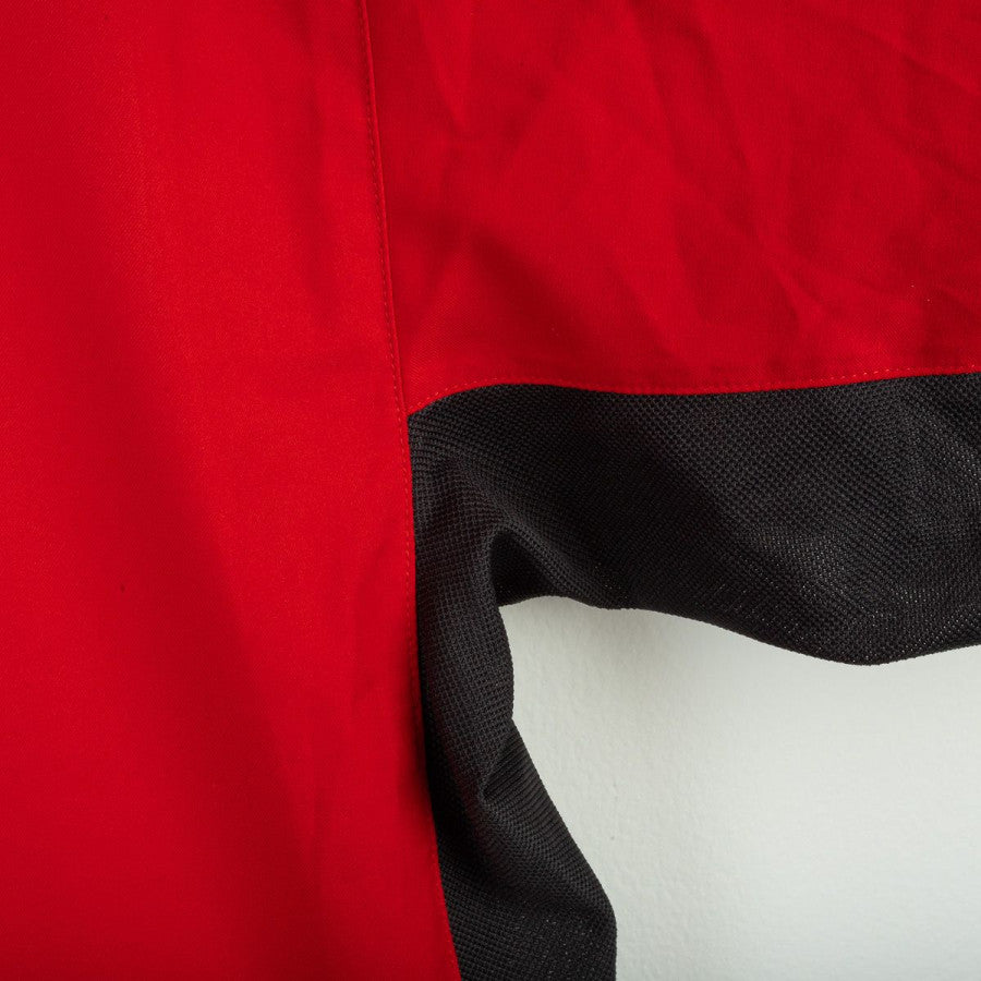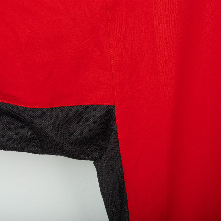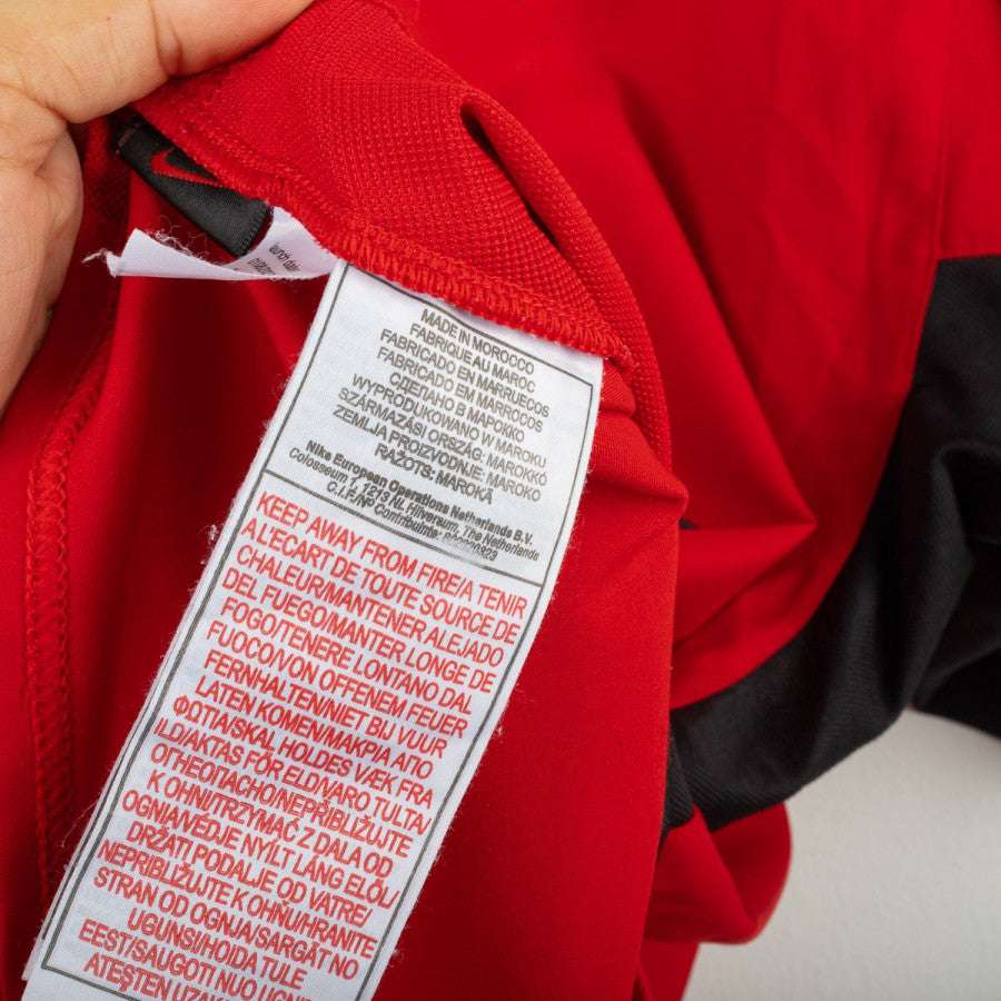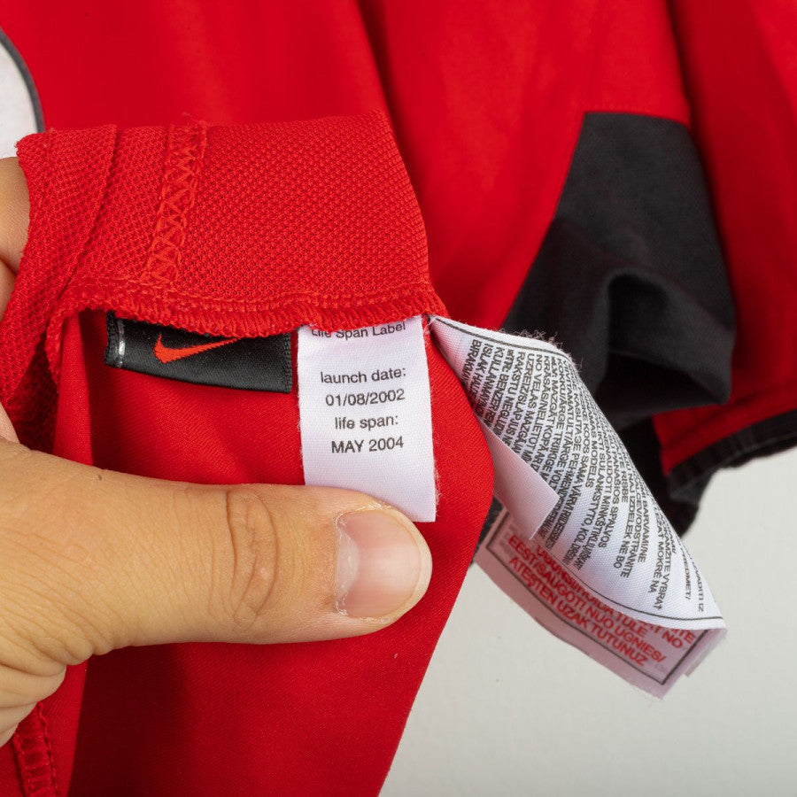 Maglia home del Manchester United utilizzata nella stagione 2002/2003, prodotta da Nike. Colore rosso con inserti laterali neri e dettagli a contrasto sul colletto. Logo Nike ricamato sul petto destro, stemma Manchester United cucito lato cuore. Sponsor “Vodafone” applicato in materiale flock bianco e nero. Numero 16 e nome “Keane” applicati sul retro . Tessuto tecnico in poliestere traspirante. Made in Morocco. Vestibilità regolare. Taglia L.