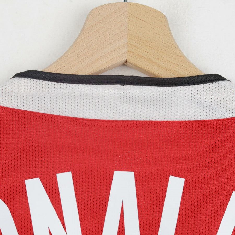 Maglia home ufficiale del Manchester United, stagione 2004/2005, prodotta dallo sponsor tecnico Nike. Di colore rosso con dettagli bianchi e neri, presenta il logo Nike ricamato sul petto destro e lo stemma del club cucito lato cuore. Al centro è applicato lo sponsor commerciale Vodafone. Sul retro, la personalizzazione Ronaldo 7. Modello Nike Total 90, taglia M, maniche corte.