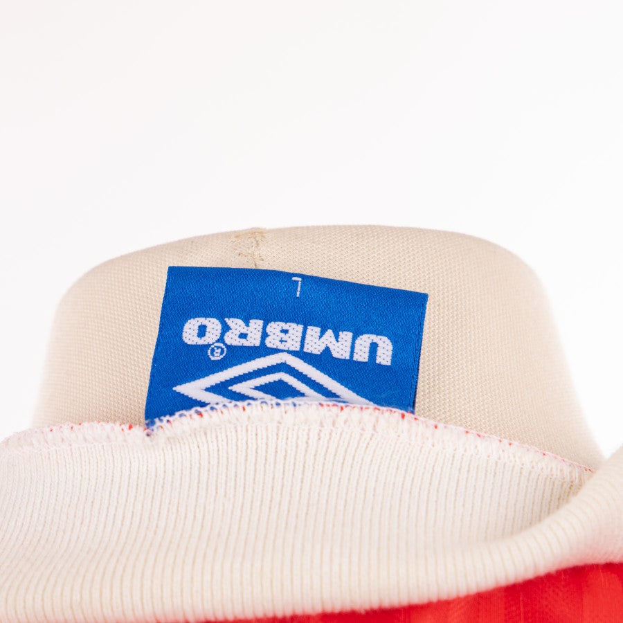 Maglia home a maniche corte del Manchester United realizzata dallo sponsor tecnico Umbro ed indossata dagli atleti nella stagione 1992/1993. Modello conforme alle condizioni che si evincono dai reperti fotografici allegati. Taglia L