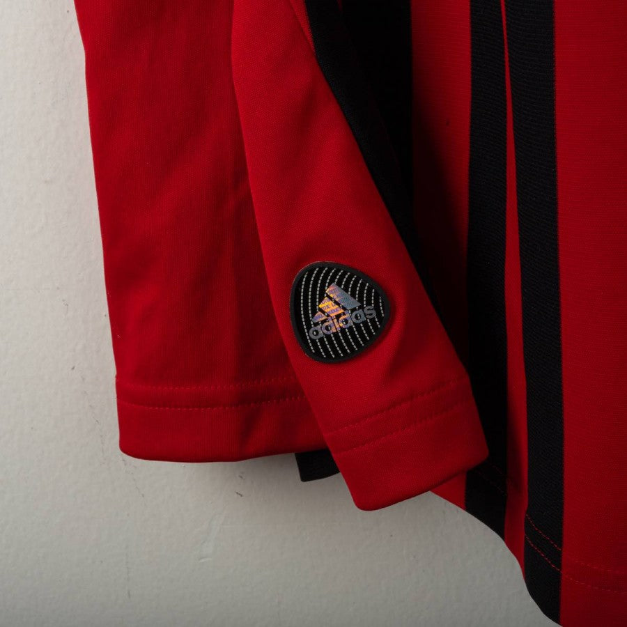 Maglia home del Milan stagione 2011/2012, realizzata da Adidas e personalizzata con nome Cassano e numero 99. Design a strisce verticali rosse e nere con dettagli bianchi. Presenti logo Adidas, stemma AC Milan con stella e scudetto tricolore al centro. Patch Serie A TIM sulla manica destra e patch 7 Champions League su quella sinistra. Colletto bianco a girocollo. Taglia XL.