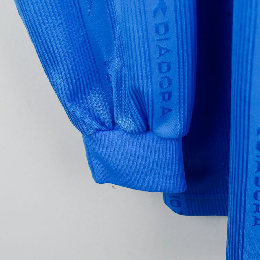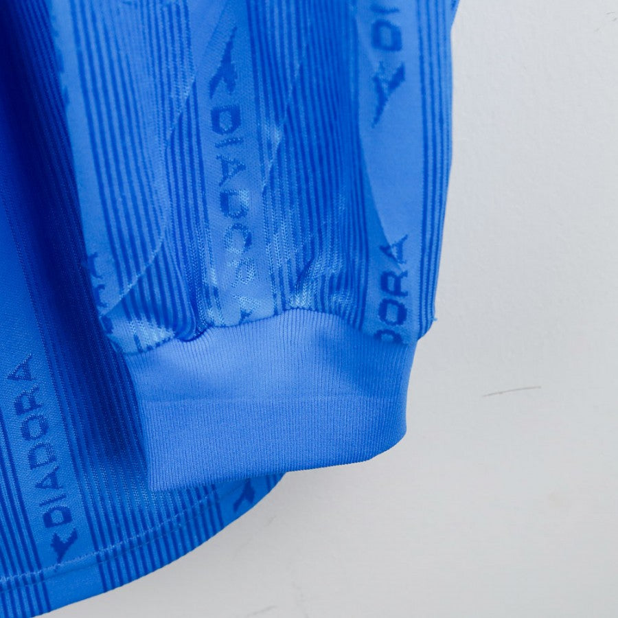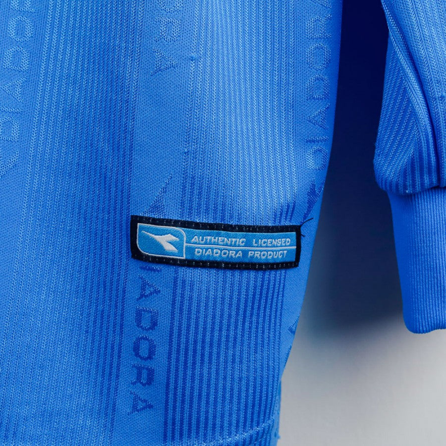 Maglia home del Napoli stagione 2001/2002, prodotta da Diadora e indossata da Francesco Moriero. Design classico azzurro con dettagli bianchi e neri, colletto a polo con bordi bianchi e inserti neri. Lo sponsor tecnico Diadora è ricamato sul petto, mentre al centro è presente lo sponsor commerciale Peroni. Sulla manica è cucita la patch della Serie A. Sul retro il nome "Moriero" e il numero 7 in bianco. Taglia XL.