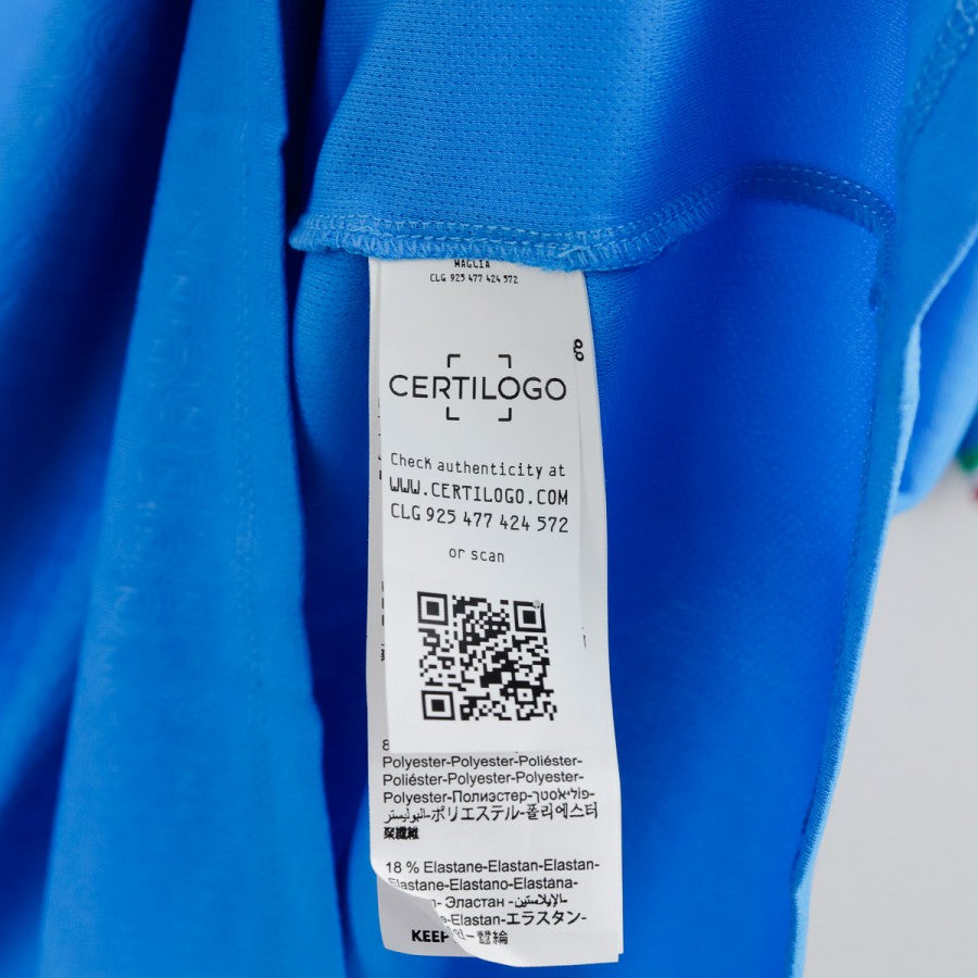 Maglia home del Napoli stagione 2023/2024 realizzata da EA7. Lo sponsor tecnico EA7 è posizionato sul petto, mentre quelli commerciali MSC, eBay e Upbit compaiono su fronte e retro. La maglia è di colore azzurro con bordi tricolore su colletto e maniche, scudetto tricolore al centro e patch Serie A sul braccio. Sul retro è presente la personalizzazione ufficiale con nome e numero di Kvaratskhelia 77. Taglia 3XL.