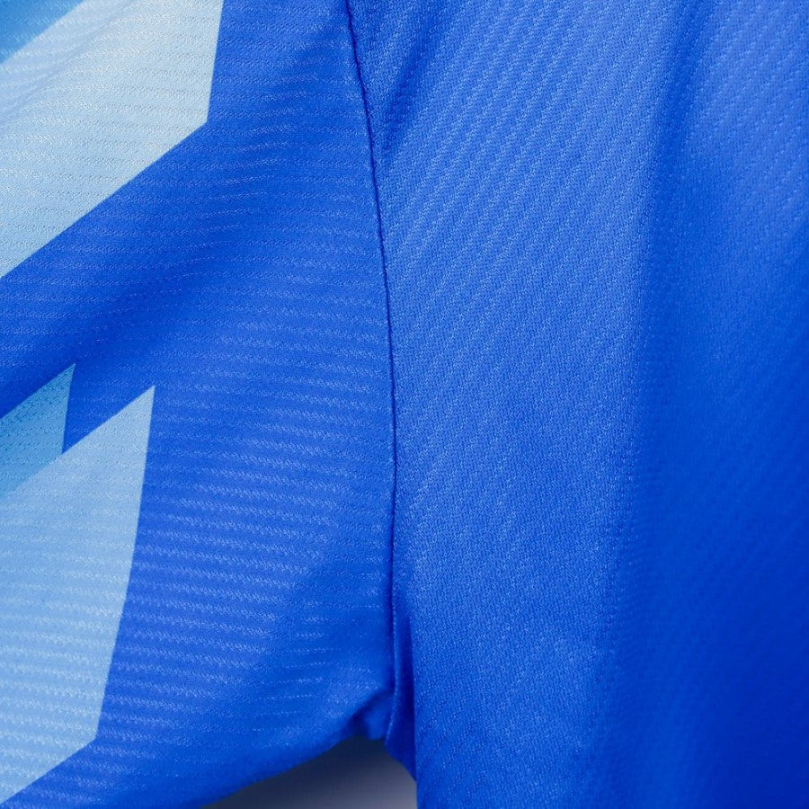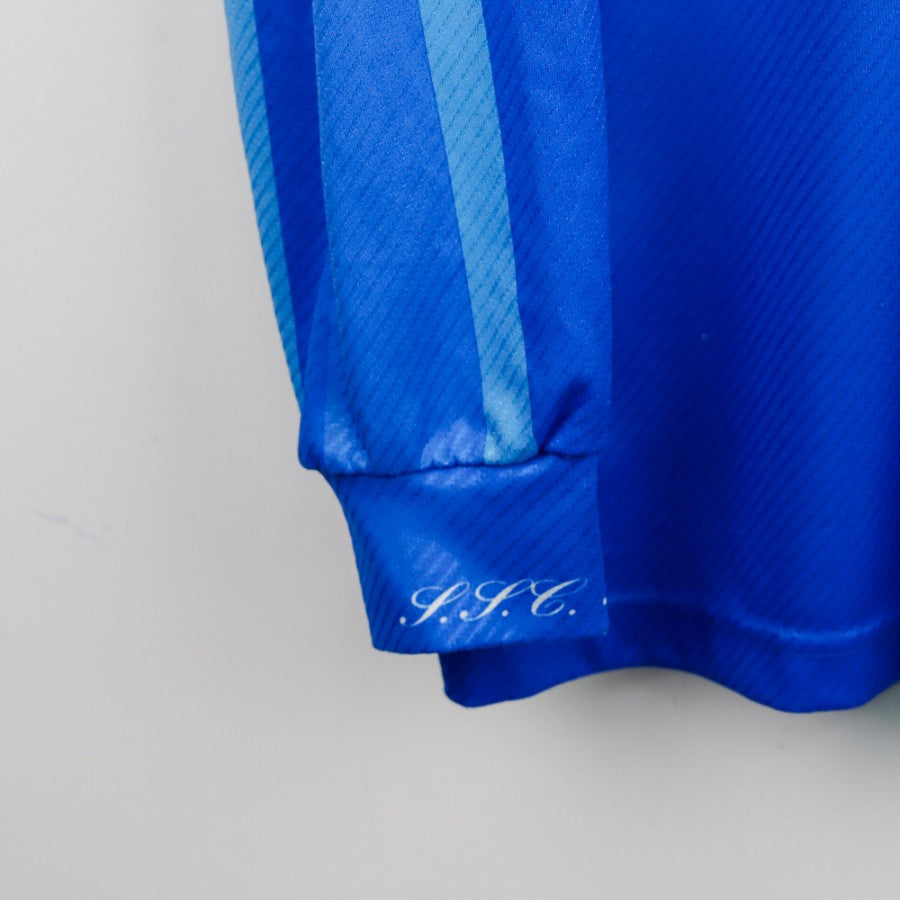 Maglia home del Napoli della stagione 1996/1997 a maniche lunghe, prodotta da Lotto. Il design azzurro presenta una grafica geometrica centrale con motivi diamantati in blu e bianco. Il colletto bianco con bordo blu conferisce un tocco retrò, mentre sulle maniche sono presenti dettagli tono su tono con le iconiche losanghe Lotto. Lo sponsor tecnico Lotto è ben visibile sul petto, insieme allo sponsor commerciale Centrale Latte di Napoli. Taglia 50.