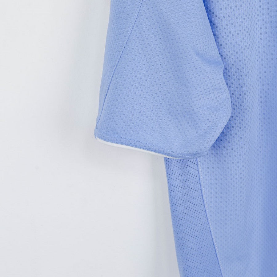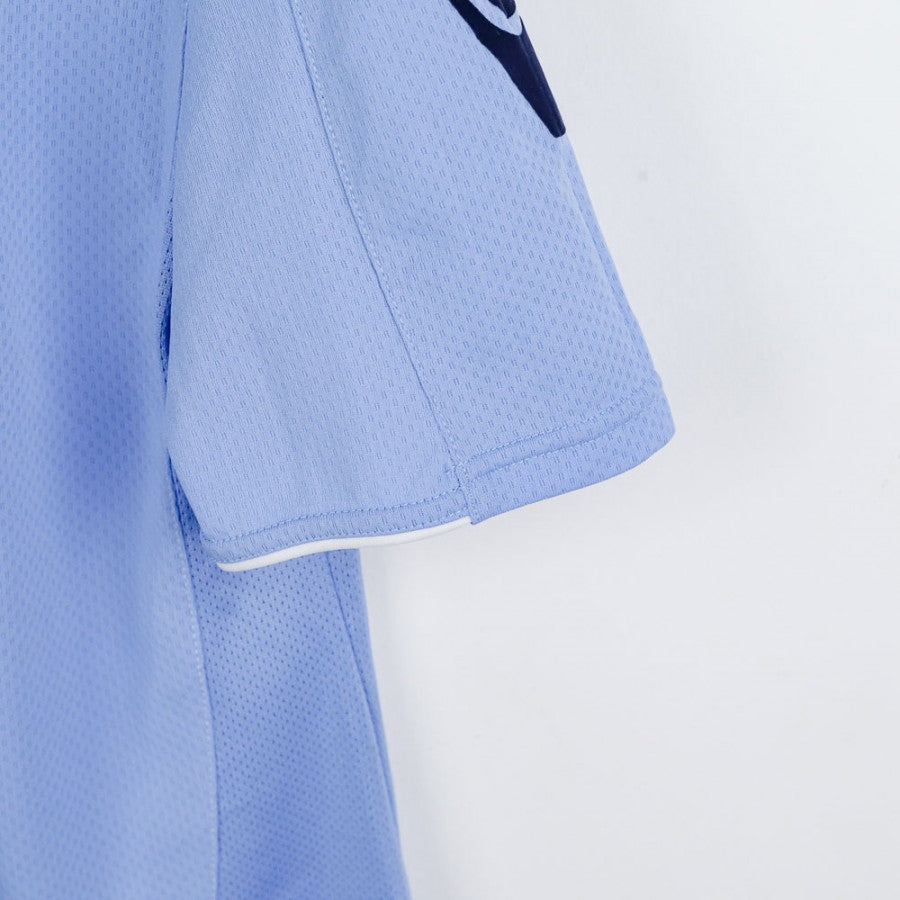 Maglia ufficiale home del Napoli, stagione 2009/2010, prodotta dallo sponsor tecnico Macron. La maglia è di colore azzurro con dettagli bianchi sul colletto e sui bordi delle maniche, presentando uno stile semplice ed elegante. Sul lato cuore è cucito il logo del club, mentre al centro si trova lo sponsor commerciale Lete in evidenza. Sul retro del colletto è ricamata la scritta "SSC Napoli". La manica destra presenta il logo della Lega Calcio, segno distintivo delle partite ufficiali. Taglia S.